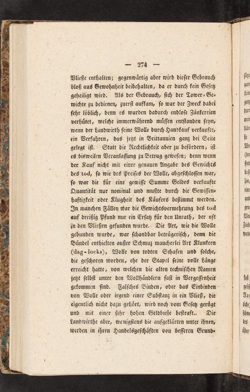 bloß aus Gewohnheit beibehalten, da er durch kein Geſetz geheiligt wird. Als der Gebrauch, ſich der Tower⸗Ge⸗ wichte zu bedienen, zuerſt aufkam, ſo war der Zweck dabei ſehr loͤblich, denn es wurden dadurch endloſe Zaͤnkereien verhuͤtet, welche immerwaͤhrend muͤſſen entſtanden ſeyn, wenn der Landwirth ſeine Wolle durch Handkauf verkaufte, ein Verfahren, das jetzt in Brittannien ganz bei Seite gelegt iſt. Statt die Rechtlichkeit aber zu befoͤrdern, iſt es bisweilen Veranlaſſung zu Betrug geweſen; denn wenn der Kauf nicht mit einer genauen Angabe des Gewichts des tod, ſo wie des Preiſes der Wolle, abgeſchloſſen war, ſo war die fuͤr eine gewiſſe Summe Geldes verkaufte Quantitaͤt nur nominal und mußte durch die Gewiſſen⸗ haftigkeit oder Klugheit des Kaͤufers beſtimmt werden. In manchen Faͤllen war die Gewichtsvermehrung des tod auf dreißig Pfund nur ein Erſatz fuͤr den Unrath, der oft in den Vließen gefunden wurde. Die Art, wie die Wolle gebunden wurde, war ſchandbar betruͤgeriſch, denn die