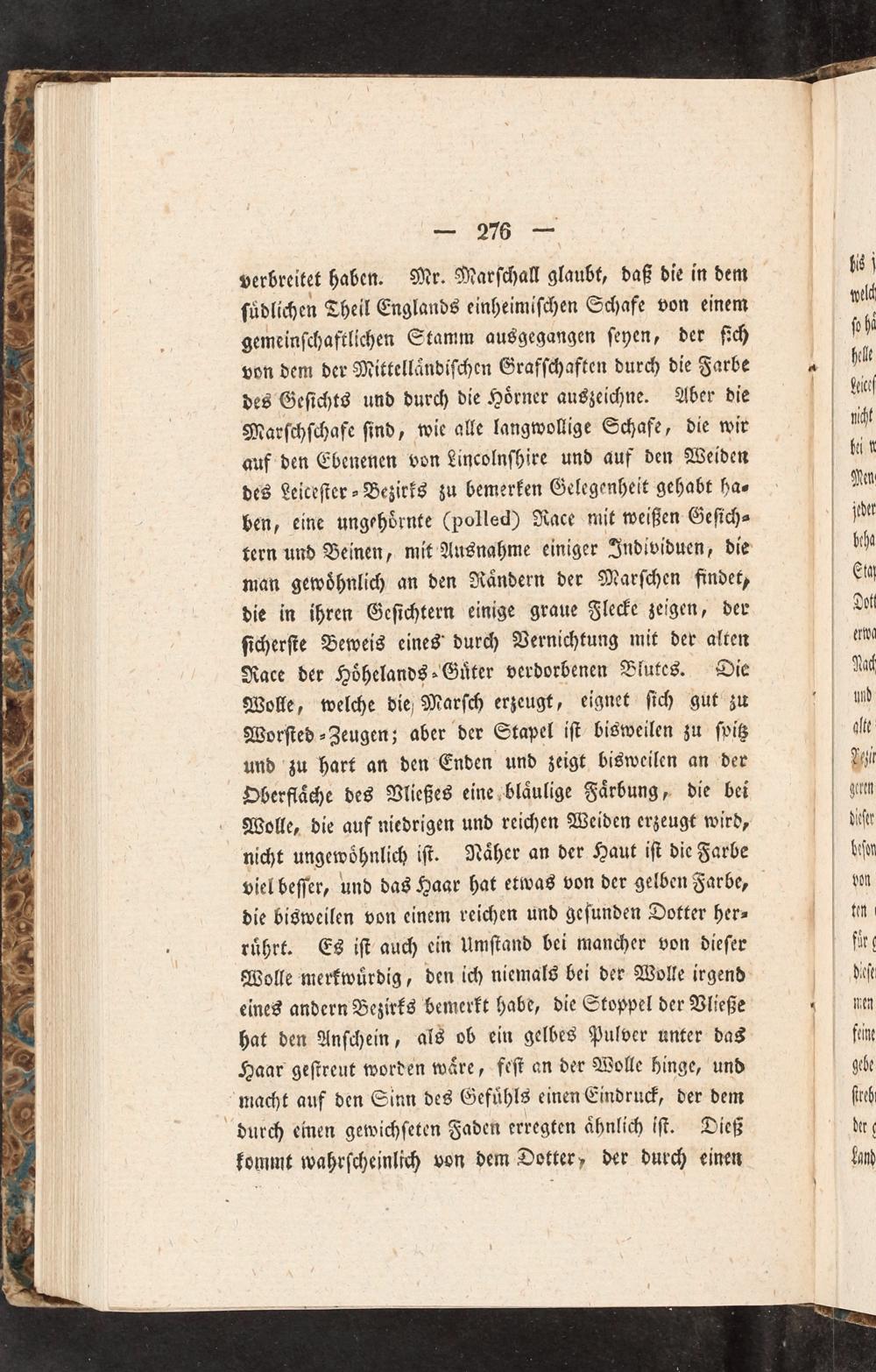 man gewoͤhnlich an den Raͤndern der Marſchen findet, die in ihren Geſichtern einige graue Flecke zeigen, der ſicherſte Beweis eines durch Vernichtung mit der alten Race der Hoͤhelands⸗Guͤter verdorbenen Blutes. Die Wolle, welche die Marſch erzeugt, eignet ſich gut zu Worſted⸗Zeugen; aber der Stapel iſt bisweilen zu ſpitz und zu hart an den Enden und zeigt bisweilen an der Oberflaͤche des Vließes eine blaͤulige Faͤrbung, die bei