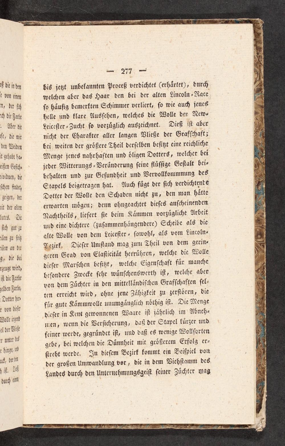 Aber die Leiceſter-Zucht ſo vorzuͤglich auszeichnet. Dieß iſt aber fe, die wi nicht der Charakter aller langen Vließe der Grafſchaft; den Weiden bei weiten der groͤßere Theil derſelben beſitzt eine reichliche t gthabt ha⸗ Menge jenes nahrhaften und oͤligen Dotters, welcher bei eißen Geſich⸗ jeder Witterungs⸗Veraͤnderung ſeine fluͤſſige Geſtalt bei⸗ dividuen, de behalten und zur Geſundheit und Vervollkommnung des ſchen fndet Stapels beigetragen hat. Auch fuͤgt der ſich verdichtende zeigen, der Dotter der Wolle den Schaden nicht zu, den man haͤtte nit der alten erwarten moͤgen; denn ohngeachtet dieſes anſcheinenden lutes. D Nachtheils, liefert ſie beim Kaͤmmen vorzuͤgliche Arbeit ſich gut zu und eine dichtere(zuſammenhaͤngendere) Scheibe als die ellen zu ſpit alte Wolle von dem Leiceſter- ſowohl, als vom Lincoln⸗ elen an der Vezirk. Dieſer Umſtand mag zum Theil von dem gerin⸗ g, die bii geren Grad von Elaſticitaͤt herruͤhren, welche die Wolle neugt wird dieſer Marſchen beſitzt, welche Eigenſchaft fuͤr manche ſt di Farbe beſondere Zwecke ſehr wuͤnſchenswerth iſt, welche aber gelben Farb⸗ von dem Zuͤchter in den mittellaͤndiſchen Grafſchaften ſel⸗ Detter he ten erreicht wird, ohne jene Zaͤhigkeit zu zerſtoͤren, die