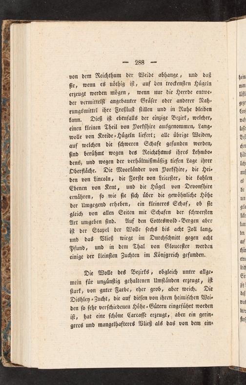 von dem Reichthum der Weide abhange, und daß ſie, wenn es noͤthig iſt, auf den trockenſten Huͤgeln erzeugt werden moͤgen, wenn nur die Heerde entwe⸗ der vermittelſt angebauter Graͤſer oder anderer Nah⸗ rungsmittel ihre Freßluſt ſtillen und in Ruhe bleiben kann. Dieß iſt ebenfalls der einzige Bezirk, welcher, einen kleinen Theil von Yorkſhire ausgenommen, Lang⸗ wolle von Kreide⸗Huͤgeln liefert; alle uͤbrige Weiden, auf welchen die ſchweren Schafe gefunden werden, ſind beruͤhmt wegen des Reichthums ihres Lehmbo⸗ dens, und wegen der verhaͤltnißmaͤßig tiefen Lage ihrer