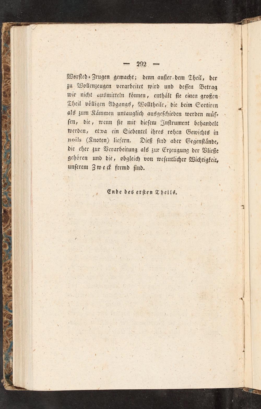 Theil voͤlligen Abgangs, Wolltheile, die beim Sortiren als zum Kaͤmmen untauglich ausgeſchieden werden muͤf⸗ ſen, die, wenn ſie mit dieſem Inſtrument behandelt werden, etwa ein Siebentel ihres rohen Gewichts in noils(Knoten) liefern. Dieß ſind aber Gegenſtaͤnde, die eher zur Verarbeitung als zur Erzeugung der Vließe gehoͤren und die, obgleich von weſentlicher Wichtigkeit, unſerem Zweck fremd ſind.
