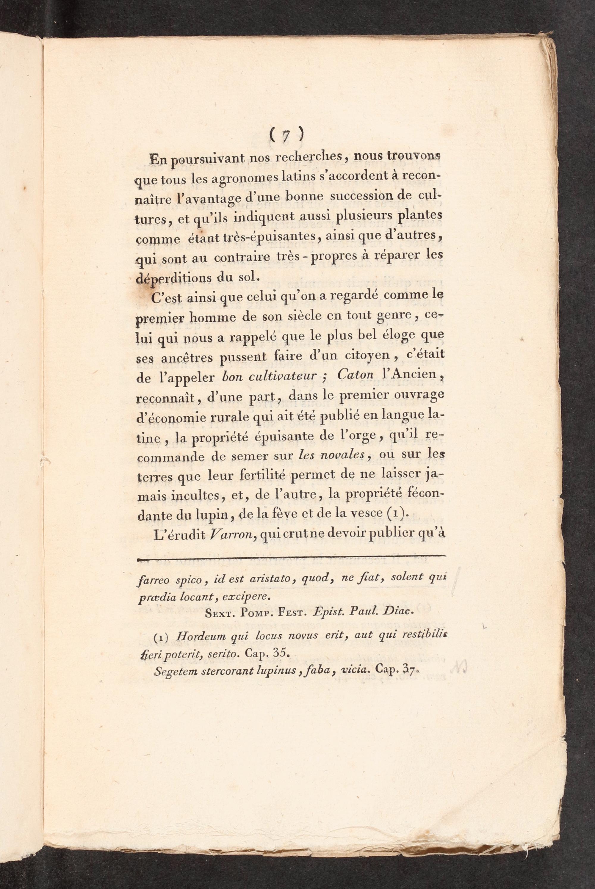 | sais du sol. est ainsi que celui qu’on a regardé comme le premier homme de son siècle en tout genre, ce- lui qui nous a rappelé que le plus bel éloge que ses ancêtres pussent faire d’un citoyen, c'était de l'appeler bon cultivateur; Caton Y'Ancien, A?£, reconnaît, d’une part, dans le premier ouvrage ’économie rurale qui ait été publié en langue la- tine, la propriété épuisante de l'orge, qu'il re- commande de semer sur Les novales, ou sur les terres que leur fertilité permet de ne laisser ja- mais incultes, et, de l’autre, la propriété fécon- dante du lupin, de la fève et de la vesce(2} L’érudit’arron, qui crutne devoir publier qu’à