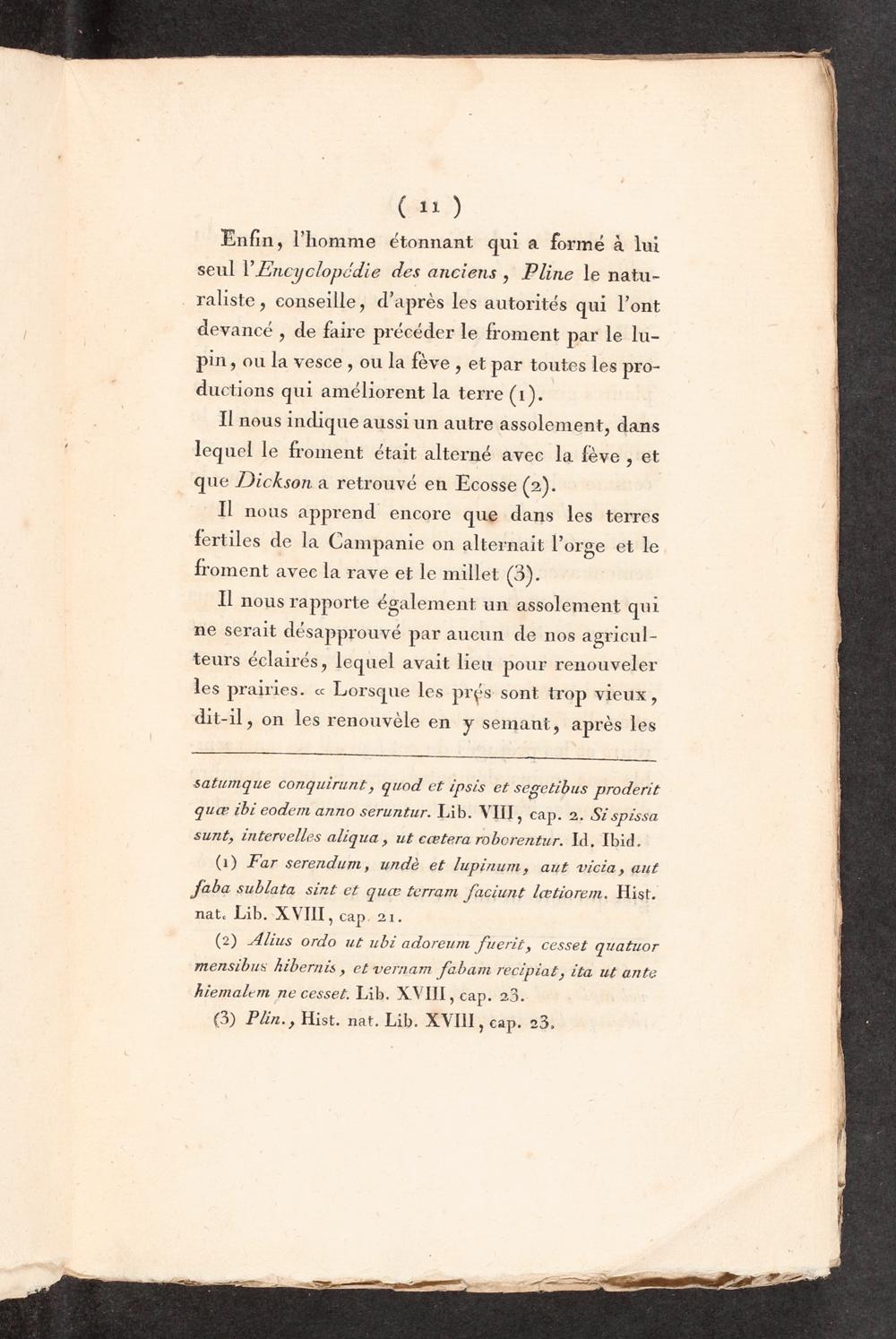 Enfin, l’homme étonnant qui a formé à lui seul l'Encyclopédie des anciens, Pline le natu- _raliste, conseille, d’après les autorités qui l’ont devancé, de faire précéder le froment par le lu- pin, ou la vesce, ou la fève, et par toutes les pro- ductions qui améliorent la terre(x):
