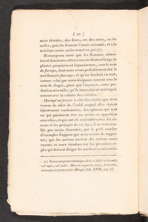 Femarquons aussi que les Romains admet- taient dans leurs cultures un excellent mélange de plantes graminées et légumineuses; sous le nom de farrago, dont nous avons probablement tiré le mot français fourrage; et qu’on fauchait en vert, comme celui que nous désignons souvent sous le nom de dragée, ainsi que lPocymum, autre pro- duction très-utile, qu’ils intercalaient avantageu- sement avec la culture des céréales.