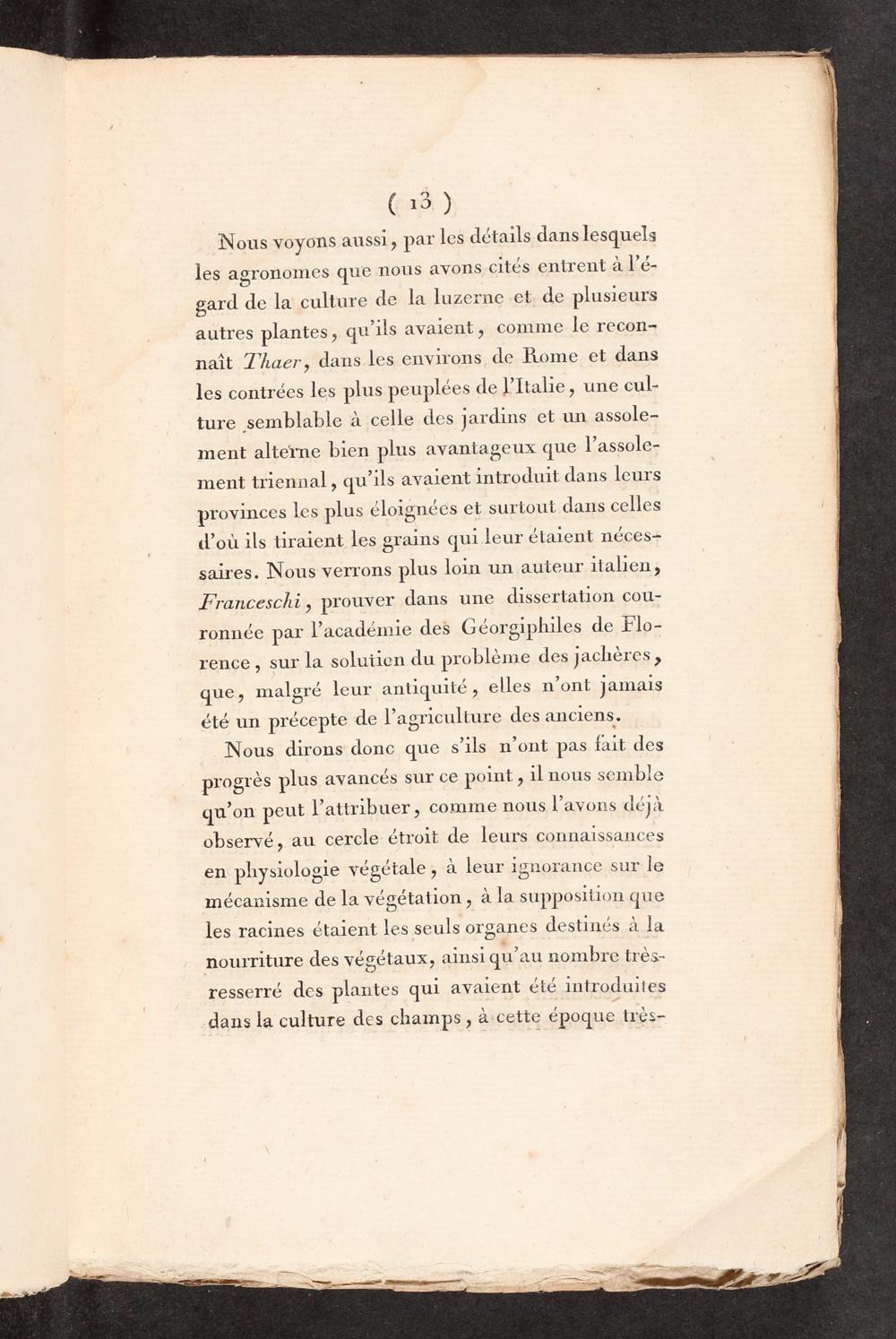 Nous voyons aussi, par les détails dans lesquels les agronomes que nous avons cités entrent à l’é- gard de la culture de la luzerne et de plusieurs autres plantes, qu'ils avaient, comme le recon- naît T'haer, dans les environs de Fiome et dans les contrées les plus peuplées de l'Italie, une cul- ture semblable à celle des jardins et un assole- ment alterne bien plus avantageux que l’assole- ment triennal, qu’ils avaient introduit dans leurs provinces les plus éloignées et surtout dans celles d’où ils tiraient les grains qui leur étaient néces- saires. Nous verrons plus loin un auteur italien, Franceschi, prouver dans une dissertation cou- ronnée par l'académie des Géorgiphiles de Flo- rence, sur la solutien du problème des jachères, que, malgré leur antiquité, elles n’ont jamais été un précepte de l’agriculture des anciens.