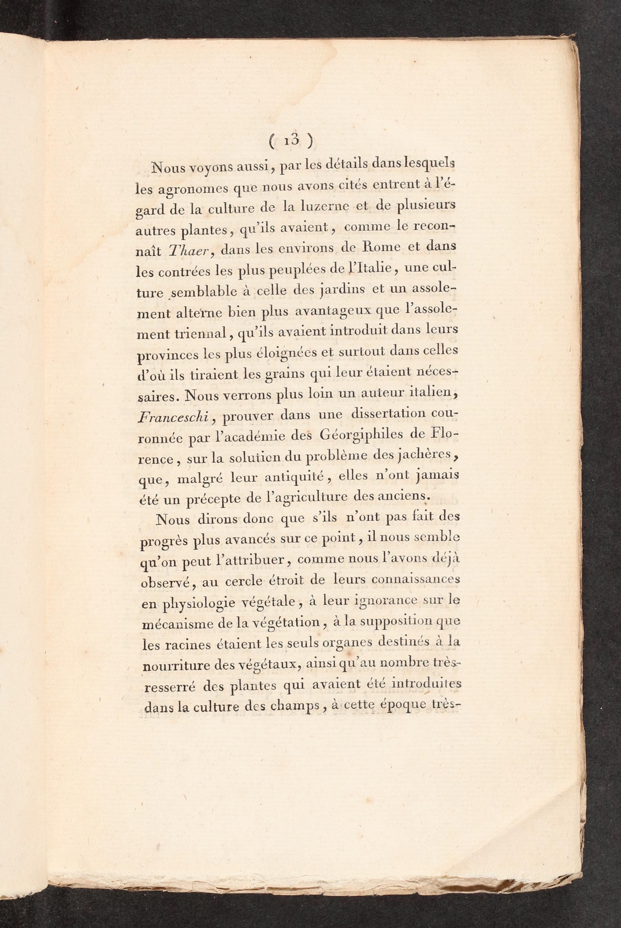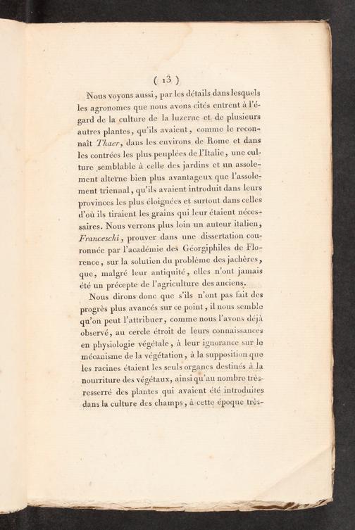 Nous dirons donc que s'ils n’ont pas fait des progrès plus avancés sur ce point, il nous semble qu’on peut l’attribuer, comme nous l’avons déjà observé, au cercle étroit de leurs connaissances en physiologie végétale, à leur ignorance sur le mécanisme de la végétation, à la supposition que les racines étaient les seuls organes destinés à la nourriture des végétaux, ainsi qu'au nombre très- resserré des plantes qui avaient été introduites