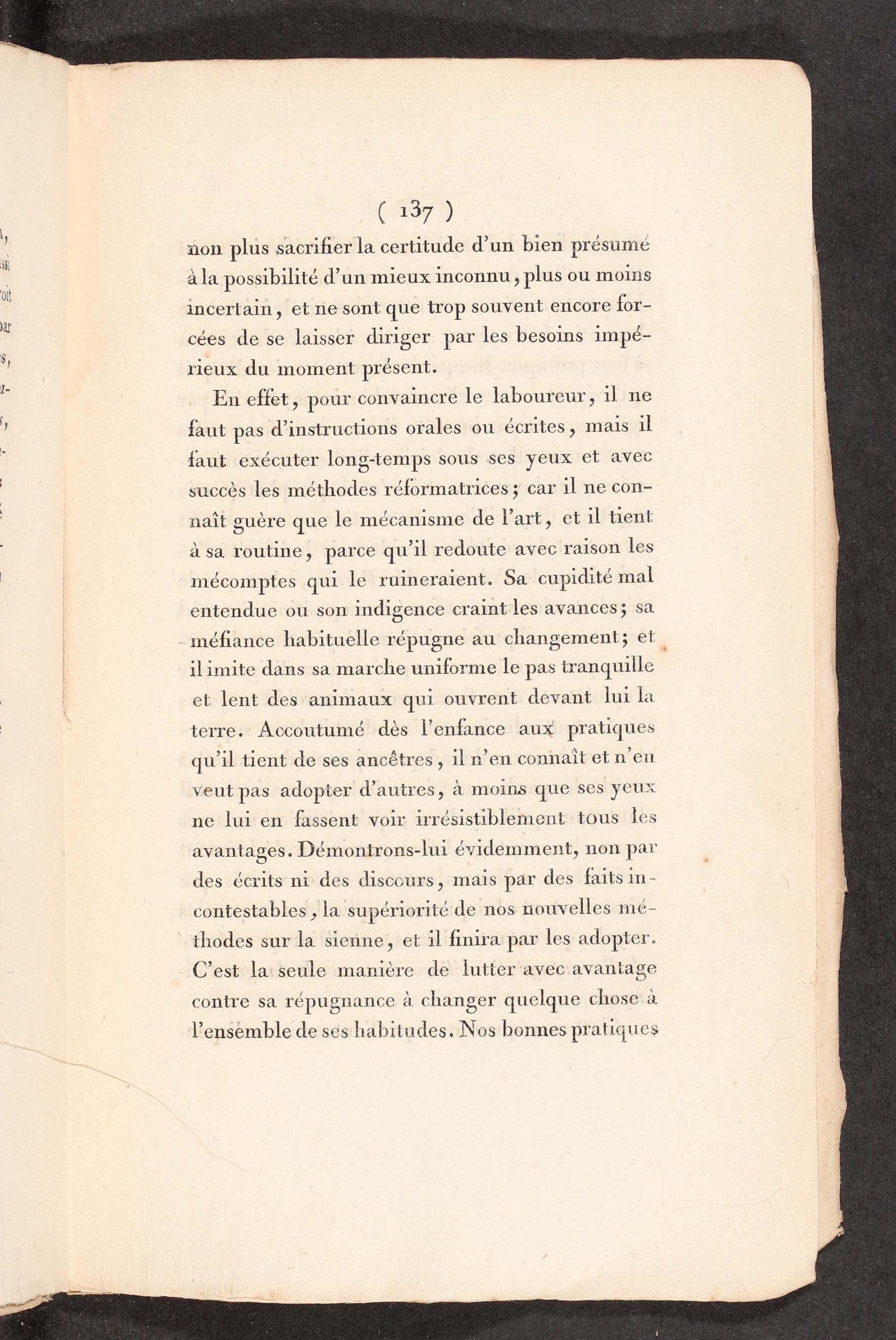 En effet, pour convaincre le laboureur, 1l ne faut pas d'instructions orales ou écrites, mais 1l faut exécuter long-temps sous ses yeux et avec succès les méthodes réformatrices; car il ne con- naît guère que le mécanisme de Part, et il tient à sa routine, parce qu’il redoute avec raison les mécomptes qui le ruineraient. Sa cupidité mal entendue ou son indigence craint les avances; sa méfiance habituelle répugne au changement; et} ilimite dans sa marche uniforme le pas tranquille et lent des animaux qui ouvrent devant Jui la terre. Accoutumé dès l’enfance aux pratiques qu'il tient de ses ancêtres, il n’en connait et n’en veut pas adopter d’autres, à moins que ses yeux ne lui en fassent voir irrésistiblement tous Îles avantages. Démontrons-lui évidemment, non par des écrits ni des discours, maïs par des faits im- contestables, la supériorité de nos nouvelles mé- thodes sur la sienne, et il finira par les adopter. C’est la seule manière de lutter avec avantage contre sa répugnance à changer quelque chose à