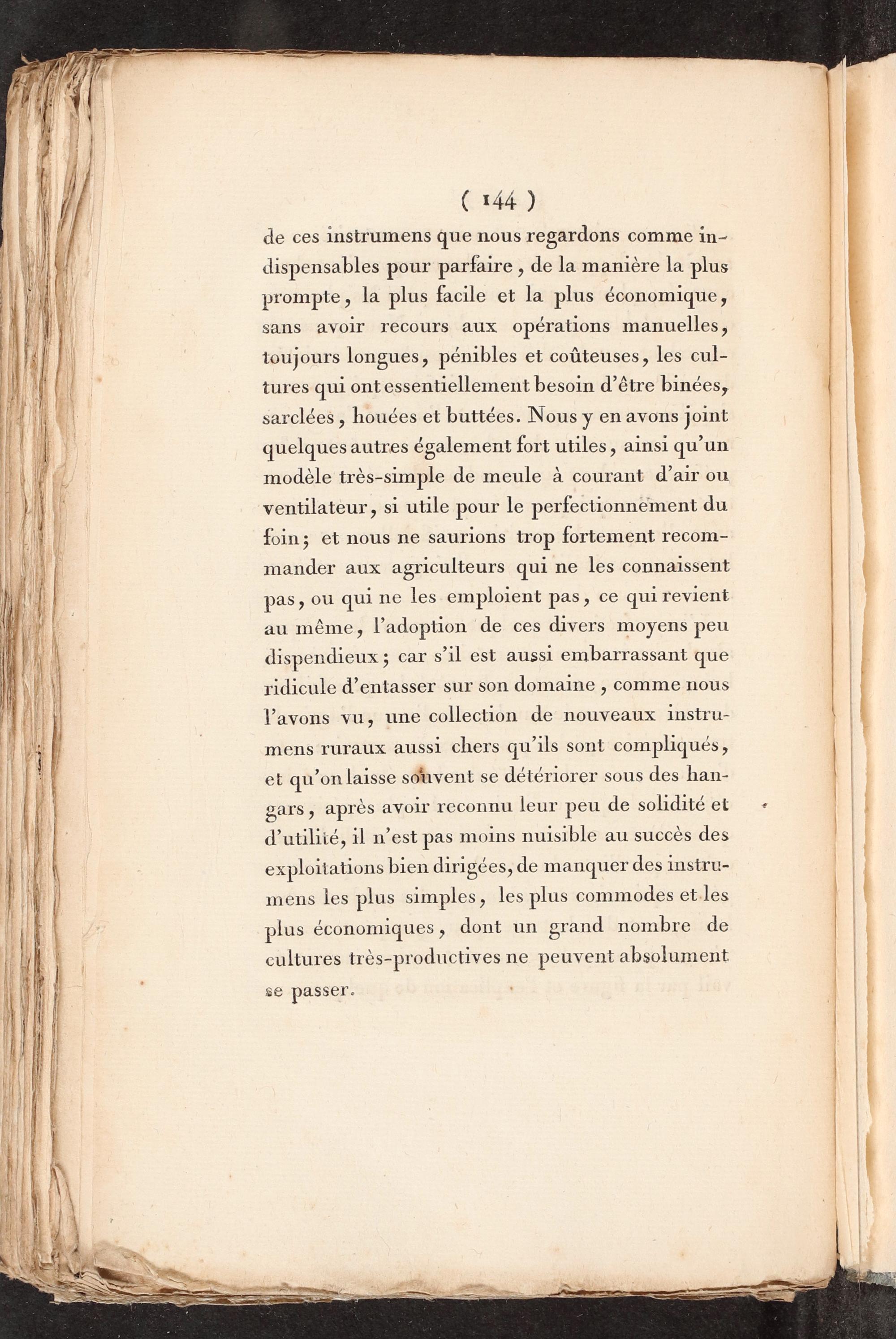 ( 144) de ces instrumens que nous regardons comme in- dispensables pour parfaire, de la manière la plus prompte, la plus facile et la plus économique, sans avoir recours aux opérations manuelles, toujours longues, pénibles et coûteuses, les cul- tures qui ont essentiellement besoin d’être binées, sarclées, houées et buttées. Nous y en avons joint quelques autres également fort utiles, ainsi qu’un modèle très-simple de meule à courant d’air ou ventilateur, si utile pour le perfectionnement du foin; et nous ne saurions trop fortement recom- mander aux agriculteurs qui ne les connaissent pas, ou qui ne les emploient pas, ce qui revient au même, l’adoption de ces divers moyens peu dispendieux; car s’il est aussi embarrassant que ridicule d’entasser sur son domaine, comme nous Vavons vu, une collection de nouveaux instru- mens ruraux aussi chers qu’ils sont compliqués, et qu’on laisse souvent se détériorer sous des han- gars, après avoir reconnu leur peu de solidité et d'utilité, il n’est pas moins nuisible au succès des exploitations bien dirigées, de manquer des instru- mens les plus simples, les plus commodes et.les plus économiques, dont un grand nombre de cultures très-productives ne peuvent absolument
