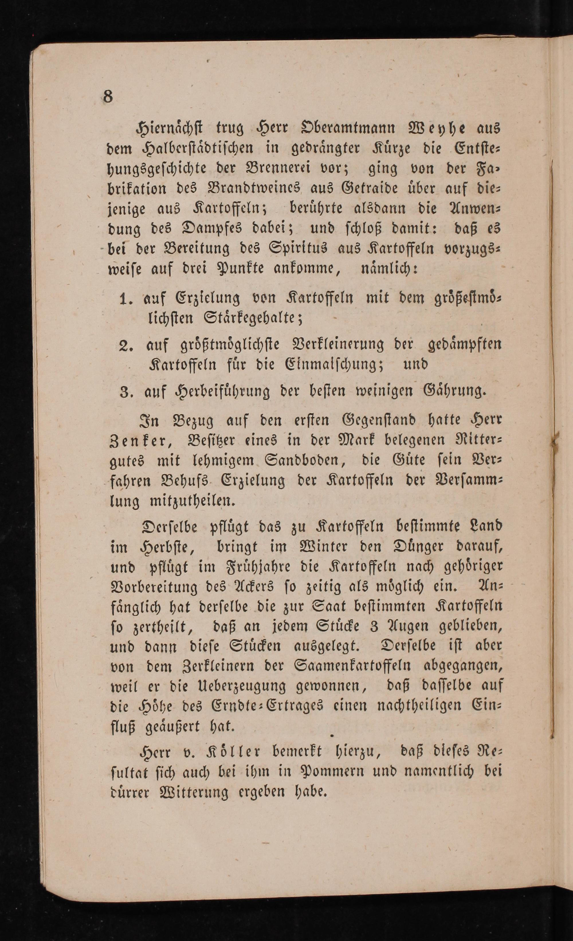 Hiernaͤchſt trug Herr Oberamtmann Weyhe aus dem Halberſtaͤdtiſchen in gedraͤngter Kuͤrze die Entſte⸗ hungsgeſchichte der Brennerei vor; ging von der Fa⸗ brikation des Brandtweines aus Getraide uͤber auf die— jenige aus Kartoffeln; beruͤhrte alsdann die Anwen⸗ dung des Dampfes dabei; und ſchloß damit: daß es bei der Bereitung des Spiritus aus Kartoffeln vorzugs⸗ weiſe auf drei Punkte ankomme, naͤmlich: