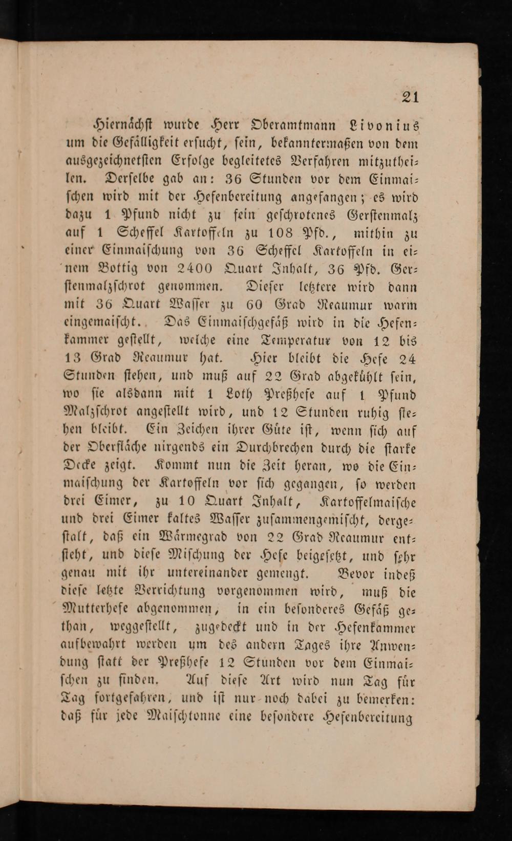 Hiernaͤchſt wurde Herr Oberamtmann Livonius um die Gefaͤlligkeit erſucht, ſein, bekanntermaßen von dem ausgezeichnetſten Erfolge begleitetes Verfahren mitzuthei— len. Derſelbe gab an: 36 Stunden vor dem Einmai— ſchen wird mit der Hefenbereitung angefangen; es wird dazu 1 Pfund nicht zu fein geſchrotenes Gerſtenmalz auf 1 Scheffel Kartoffeln zu 108 Pfd., mithin zu einer Einmaiſchung von 36 Scheffel Kartoffeln in ei— nem Bottig von 2400 Quart Inhalt, 36 Pfd. Ger⸗ ſtenmalzſchrot genommen. Dieſer letztere wird dann mit 36 Quart Waſſer zu 60 Grad Reaumur warm eingemaiſcht. Das Einmaiſchgefaͤß wird in die Hefen— kammer geſtellt, welche eine Temperatur von 12 bis 13 Grad Reaumur hat. Hier bleibt die Hefe 24 Stunden ſtehen, und muß auf 22 Grad abgekuͤhlt ſein, wo ſie alsdann mit 1 Loth Preßhefe auf 1 Pfund Malzſchrot angeſtellt wird, und 12 Stunden ruhig ſte— hen bleibt. Ein Zeichen ihrer Guͤte iſt, wenn ſich auf der Oberflaͤche nirgends ein Durchbrechen durch die ſtarke Decke zeigt. Kommt nun die Zeit heran, wo die Ein— maiſchung der Kartoffeln vor ſich gegangen, ſo werden drei Eimer, zu 10 Quart Inhalt, Kartoffelmaiſche und drei Eimer kaltes Waſſer zuſammengemiſcht, derge— ſtalt, daß ein Waͤrmegrad von 22 Grad Reaumur ent— ſteht, und dieſe Miſchung der Heſe beigeſetzt, und ſehr genau mit ihr untereinander gemengt. Bevor indeß dieſe letzte Verrichtung vorgenommen wird, muß die MNutterhefe abgenommen, in ein beſonderes Gefaͤß ge⸗ than, weggeſtellt, zugedeckt und in der Hefenkammer aufbewahrt werden um des andern Tages ihre Anwen— dung ſtatt der Preßhefe 12 Stunden vor dem Einmai— ſchen zu finden. Auf dieſe Art wird nun Tag fuͤr Tag fortgefahren, und iſt nur noch dabei zu bemerken: daß fuͤr jede Maiſchtonne eine beſondere Hefenbereitung