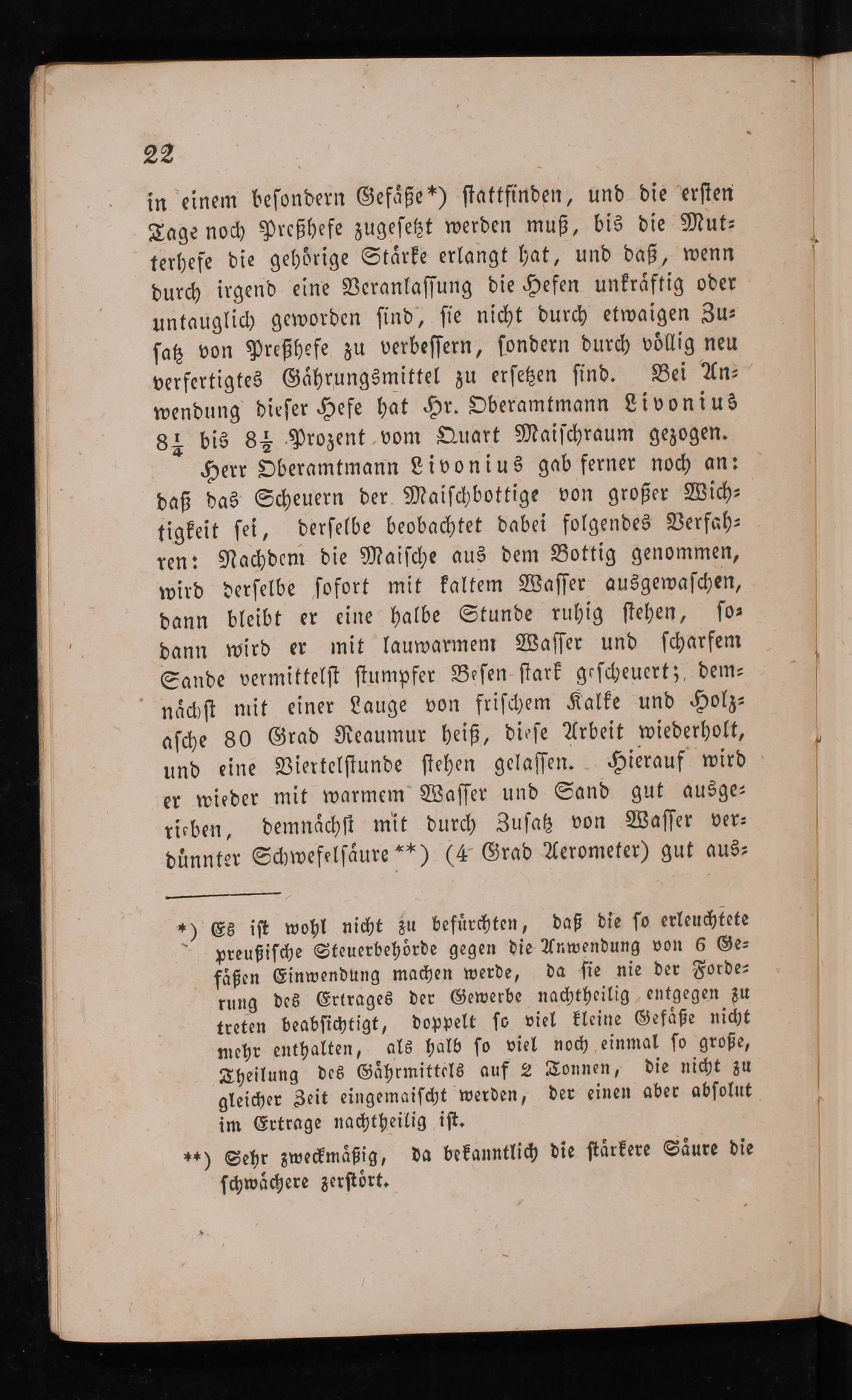 in einem beſondern Gefaͤße*) ſtattfinden, und die erſten Tage noch Preßhefe zugeſetzt werden muß, bis die Mut⸗ terhefe die gehoͤrige Staͤrke erlangt hat, und daß, wenn durch irgend eine Veranlaſſung die Hefen unkraͤftig oder untauglich geworden ſind, ſie nicht durch etwaigen Zu⸗ ſatz von Preßhefe zu verbeſſern, ſondern durch voͤllig neu verfertigtes Gaͤhrungsmittel zu erſetzen ſind. Bei An⸗ wendung dieſer Hefe hat Hr. Oberamtmann Livonius 8 ½ bis 8 ½ Prozent vom Quart Maiſchraum gezogen.
