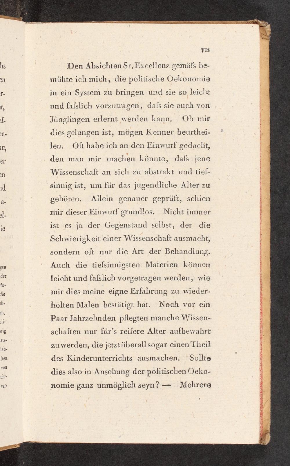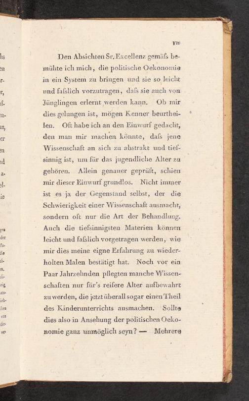 Den Absichten Sr, Excellenz gemäfs be- mühte ich mich, die politische Oekonomie in ein System zu bringen und sie so leicht und faßslich vorzutragen, dafs sie auch von Jünglingen erlernt werden kann. Ob mir dies gelungen ist, mögen Kenner beurthei- len. Ofthabe ich an den Einwurf gedacht, den man mir machen könnte, dafs jene Wissenschaft an sich zu abstrakt und tief- sinnig ist, um für das jugendliche Alter zu gehören. Ailein genauer geprüft, schien mir dieser Einwurf grundlos. Nicht immer ist es ja der Gegenstand selbst, der die Schwierigkeit einer Wissenschaft ausmacht, sondern oft nur die Art der Behandlung. Auch die tiefsinnigsten Materien können leicht und falslich vorgetragen werden, wie mir dies meine eigne Erfahrung zu wieder- holten Malen bestätigt hat. Noch vor ein Paar Jahrzehnden pflegten manche Wissen- schaften nur für’s reifere Alter aufbewahrt zu werden, die jetztüberallsogar einen Theil des Kinderunterrichts ausmachen. Sollte dies also in Ansehung der politischen Oeko-