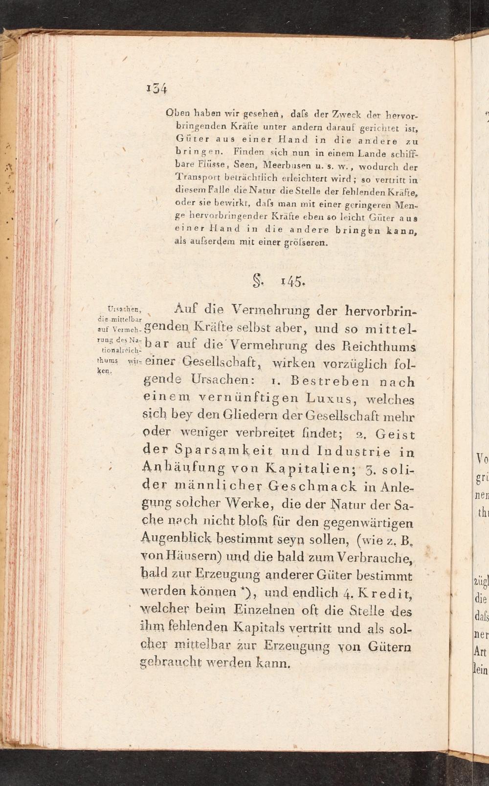 Oben haben wir gesehen, dafs der Zweck dar hervor- bringenden Kräfte unter andern darauf gerichtet ist, Güter aus einer Hand in die andere zu \ bringen. Finden sich nun in einem Lande schiff- bare Flüsse, Seen, Meerbusen u. s. w. ‚ wodurch der Transport beträchtlich erleichtert wird; so vertritt in diesemFalle die Natur die Stelle der fehlenden Kräfte, oder sie bewirkt, dafs man mit einer geringeren Men- ge hervorbringender Kräfte eben so leicht Güter aus einer Hand in die andere bringen kann, als aulserdem mit einer grölseren.