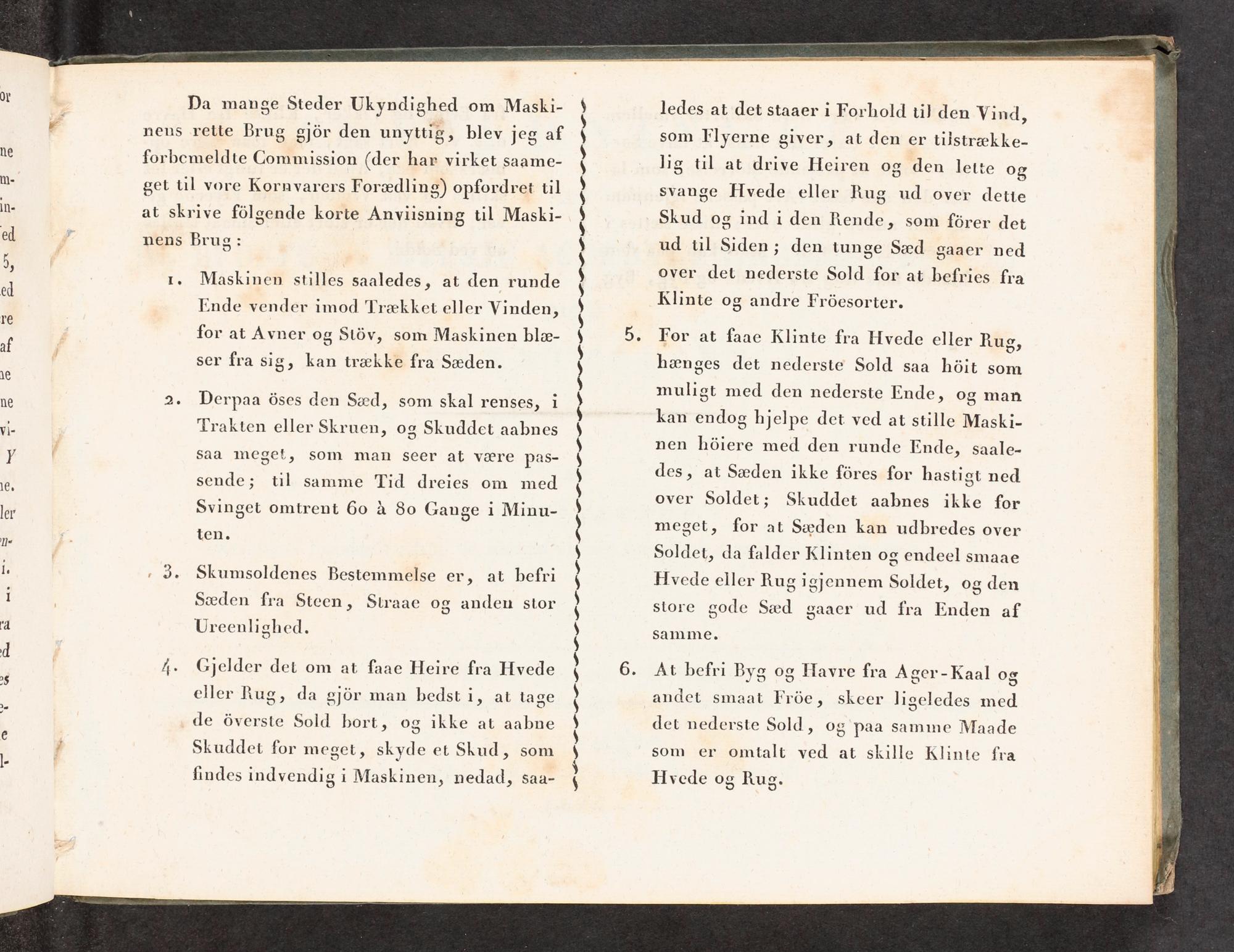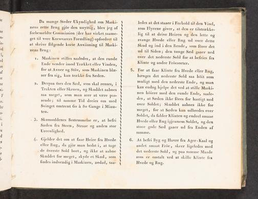 For at faae Klinte fra Hvede eller Rug, hænges det nederste Sold saa håit som muligt med den nederste Ende, og man kan endog hjelpe det ved at stille Maski- nen hojere med den runde Ende, saale- des, at Sæden ikke fåres for hastigt ned over Soldet; Skuddet aabnes ikke for meget, for at Sæden kan udbredes over Soldet, da falder Klinten og endeel smaae Hvede eller Rug igjennem Soldet, og den store gode Sæd gaaer ud fra Enden af