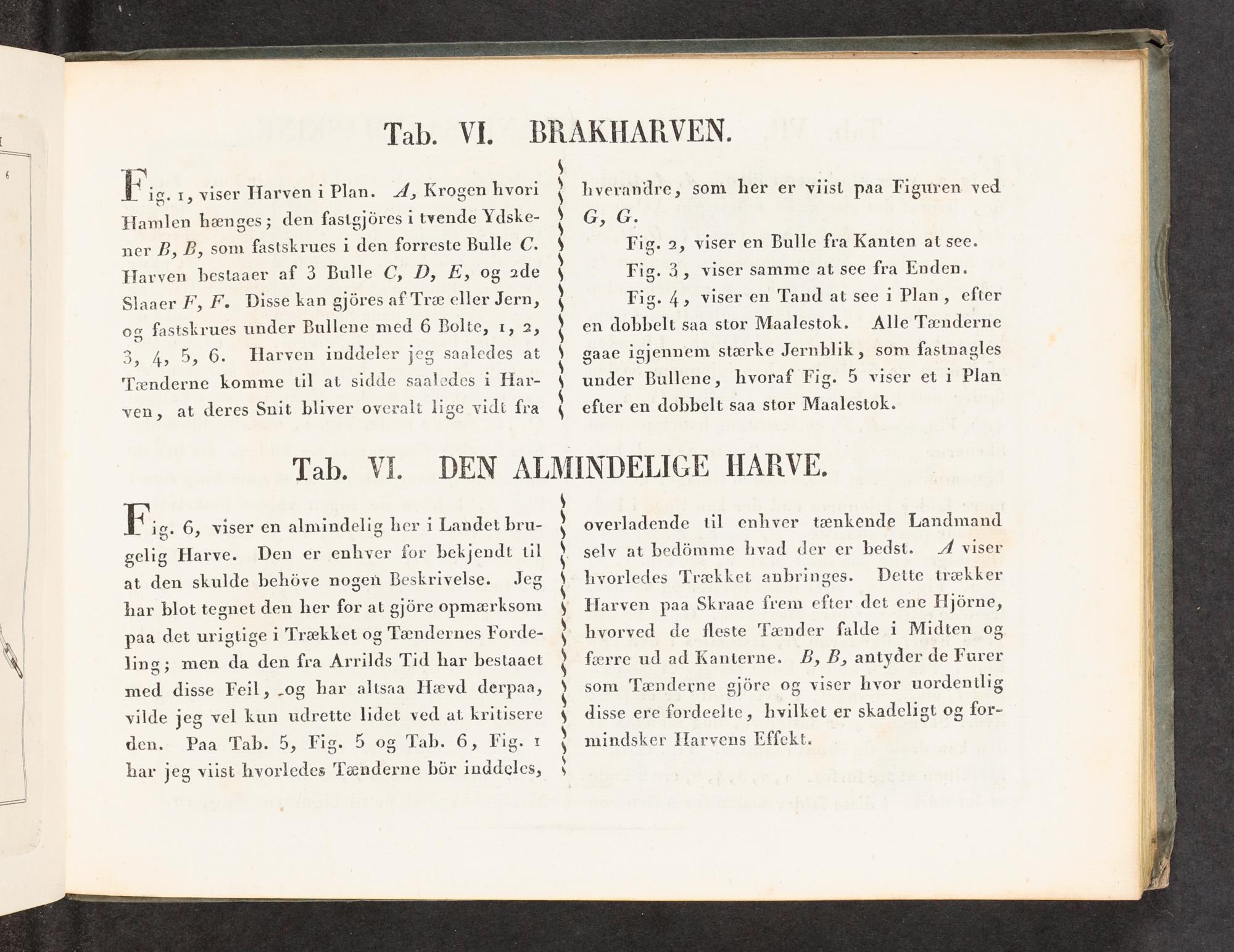FF. 6, viser en almindelig her i Landet bru- gelig Harve. Den er enhver for bekjendt til at den skulde behåve nogen Beskrivelse. Jeg har blot tegnet den her for at gjore opmærksom paa det urigtige 1 Trækket og Tændernes Forde- ling; men da den fra Arrilds Tid har bestaaet med disse Feil,.og har altsaa Hævd derpaa, vilde jeg vel kun udrette lidet ved at kritisere dén... Paa Tab. 5, Fig, 5 og. Tab. 6, Fig. 1