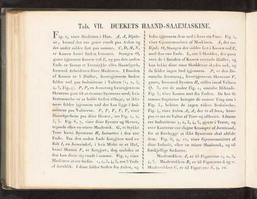ledes igjennem dem ned i. hversin Fure. Fig. 3, viser Gjennemsnittet af Maskinen. AX, det ene Hjul; O, Stangen der sidder fast i Kassen ved E, med den ene Ende. Z, ere 5 Skodder, der passe over de i Bunden af Kassen værende Huller, og kan lukke disse naar Skodderne skydes ind, og da falder ingen Sæd igjennem. P, er den får- omtalte Jernstang, hvorigjennem Skruerne F, gaaer, hvormed Byrsten H, stilles imod Valtsen Q. 5, ere de under Fig. 1, omtalte Bliktude: Fig. 5, viser Kassen seet fra Enden. Da her de samme Bogstaver betegne de samme Ting som i Fig. 3, behåve de ingen videre Beskrivelse. Fig. 4, viser Axlen A, AZ, der er af Jern, hvor- paa er sat en Valtse af Træe og afdreiet. I denne ere'Indsnittene 1; 2,3, 4,75, gjorte i Træet,;og over Kanterne ere slagne Kramper af Jerniraad, for at forebygge at ikke Byrsterne skal afslide dem. Fig. 8, 9, 10, viser Gjennemsniitet af disse Indsnit, efter en stårre Maalestok, og til forskjellige Sædarter.