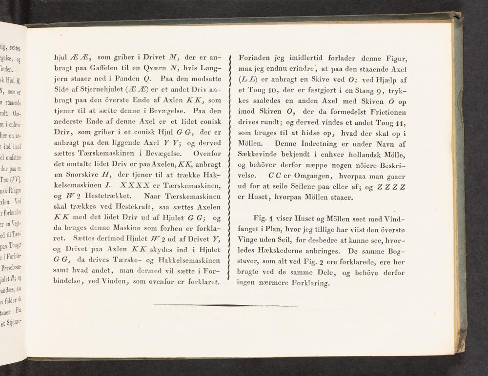 Fig. 1 viser Huset og Mållen seet med Vind- fanget i Plan, hvor jeg tillige har viist den&verste Vinge uden Seil, for desbedre at kunne see, hvor- ledes Hækskederne anbringes. De samme Bog- staver, som alt ved Fig. 2 ere forklarede, ere her brugte ved de samme Dele, og behåve derfor
