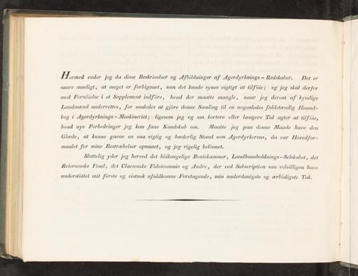 Flere ender jeg da disse Beskrivelser og Afbildninger af" Agerdyrknings= Redskaber. Det er saare mueligt, at meget er forbigaaet, som det kunde synes vigtigt at tilfåie; og jeg skal derfor med Fornoielse i et Supplement indføre, hvad der maatte mangle, naar jeg derom af kyndige Landmænd underrettes, for saaledes at gjøre denne Samling til en nogenledes fuldstændig Haand- bog i Agerdyrknings— Maskineriet;. ligesom jeg og om kortere eller længere Tid agter at tilfoie, hvad nye Forbedringer jeg kan faae Kundskab om, IMaatte jeg paa denne Maade have den Glæde, at kunne gavne en saa vigtig og hæderlig Stand som Agerdyrkerens, da var ITovedfor— maalet for mine Bestræbelser opnaaet, og jeg rigelig belonnet.