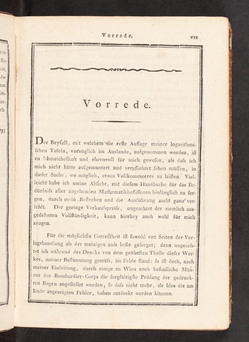 6 ene. du. 1 lln, di. f am ivi. . VWorrede. th-h 793 Der Beyfall, mit welchem die erſte Auflage meiner logarithmi- ſchen Tafeln, vorzüglich im Auslande, aufgenommen worqden, iſt zu ſchmeichelhaft und ehrenvoll für mich gewefen, als dafs ich mich nicht hätte aufgemuntert und verpflichtet fehen müſſen, in dieſer Sache, wo möglich, etwas Vollkommneres zu leiſten. Viel- leicht habe ich meine Abſficht, mit dieſem Handbuche für das Be- dürfniſs aller angehenden Matllematikbefliſfenen hinlänglich zu ſor- gen, durch mein ‚Beſtreben und die Ausführung nicht ganz ver- fehlt. Der geringe Verkaufspreiſs, ungeachtet der ziemlich aus- gedehnten Vollſtändigkeit, kann hierbey auch wohl für mich zeugen.