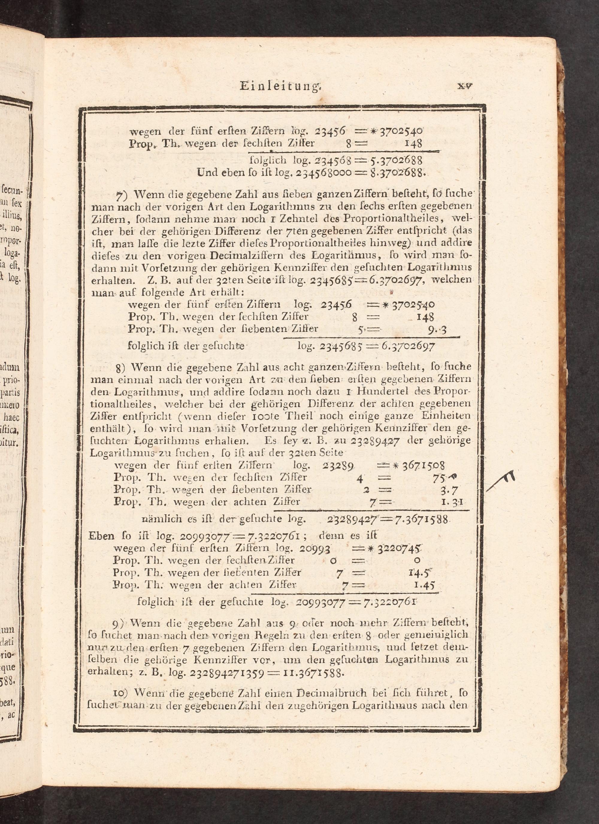 8) Wenn die gegebene Zahl aus acht ganzen Ziffern beſteht, ſo fuche man einmal nach der vorigen Art zu den ſieben erſten gegebenen Ziffern den Logarithmus, und addire lodann noch dazu I Hundertel des Propor- tionaltheiles, welcher bei der gehörigen Differenz der achten gegebenen Ziffer entſpricht(wenn dieler 100te Theil noch einige ganze Einheiten enthält), lo wird imnan mit Vorletzung der gehörigen Kennziffer den ge- ſuchten Logarithmus erhalien. Es ſey z. B. zu 23289427 der gehörige Logarithmus zu fuchen, ſo iſt auf der 32ten Seite