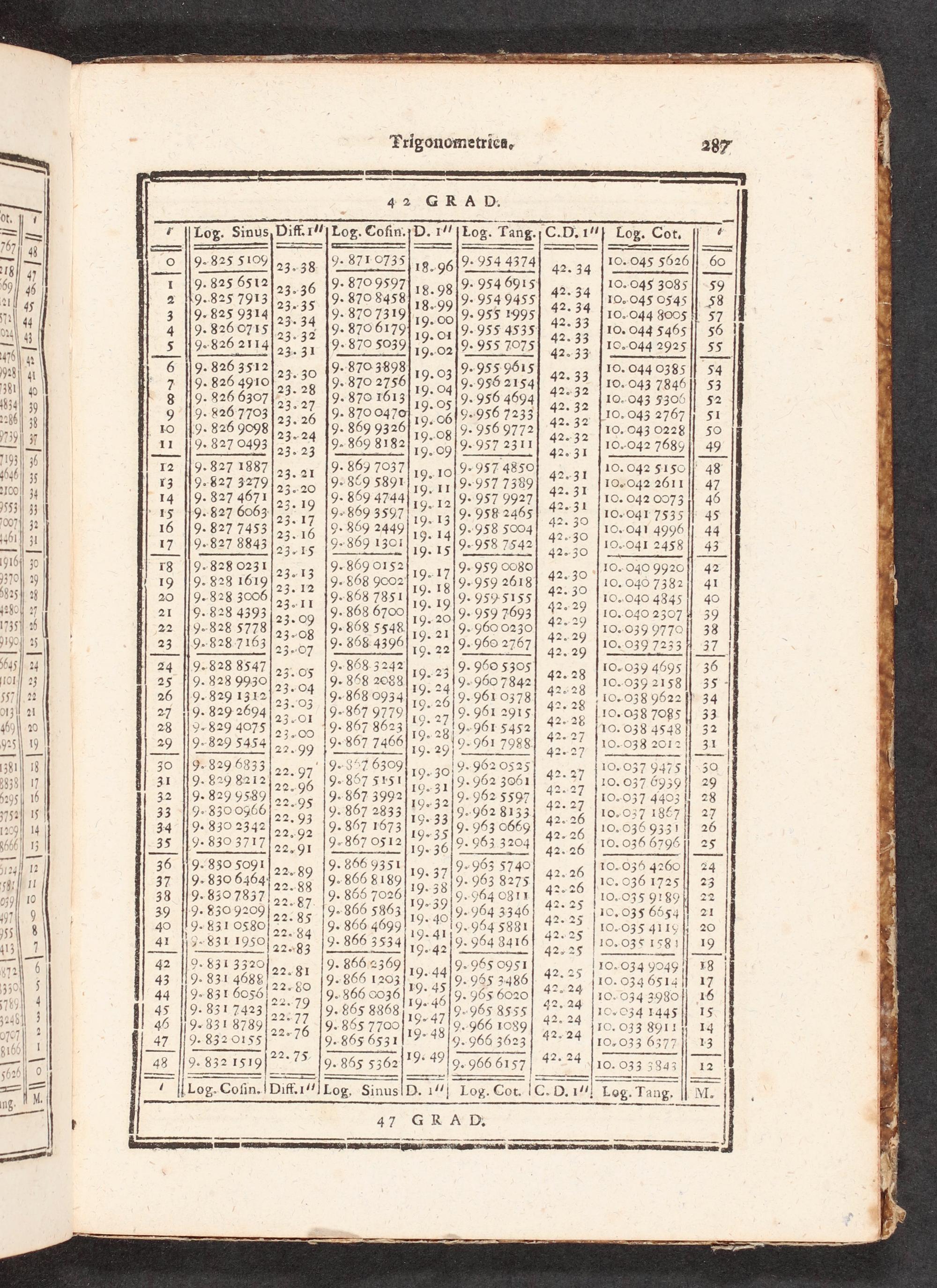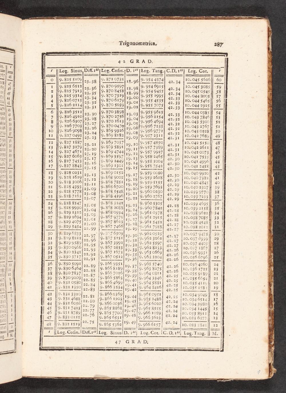 ——— 5 Trigonometrica. 287 —— ——— 4 2 G RA D. — 8..— — 7[Log. Sinus Diff. 1Log. Cofin. D. 1Eog. Tang. C. D. 11† Log. Cot. 56————— 2 2. 626]G 60 7 4 2 9. 825 5107 23. 38 2=3710735 19.96 2.254 4374] 42. 34 215—— 10. 045 3085 77 9s e 32-70 s. 3ſs.23 93 21 5 ,.5 9746 a 9.325 7913 23.35[9.870 8458718.99 975 1995 42. 34 10.044 8005 57 2— 45 1 3 9. 825 9314 23. 34 9. 870449 19.00 9- 55 4535 2. 33 10. 044 5465 4 56 14 4[9. 826 0715 23. 32 9- 870 179 19. O1 9.9 5 7075 42. 33 10. 044 2925] 55 A4 2825 2114[23. 31[2.870032 19.02 2. 255 7075 42.33 0440385 54 — 10. eeeee diſ 2[9. 326 4910/23. 28 9. 19.04 5. 956 4694 42-32 10.043 5306 52 1 8 0. 326 6307 2. 9. 870 161371 05 9.959 459442. 32 72 1 3. 27 70 19·05 9. 956 7233 10. 043 2767 51 834 39 9. 826 7703 6[2. 870047 19. 069·9 72 42. 32 0228] 50 ens 3 15 9.236 098 33,29*0 e72919⸗3, ir d711 aa-z('S. 6 3473:] u 773937..827 0493 80 69— 42.51 ¹— —— 225. 23. 23 69 7037 1905 9 957 4850 10. O42 5150]48 7193 36 12[9. 327 1887 23. 21[9.8527 5119. 10.957 7389 42 31[10.,042 2611] 47 4646 35 13[9.827 3279[23. 20[9-879 5891 19. 11 9.95773 231 10.042 0073] 45 21o 34 67123. 10[9-869 4744 9.957 9927] 42.31 10. 3 8 4 14[5. 327 6055 23. 17 5. 369 379, 19.13 9.95 2465] 42. 35 10.041 75354 7553% 1. 23 5 19.1 04] 42.3 5 55] 12 9.827 7453 23. 15 9.369 2449 15113 9.988 5004 42. 30 19-0 d99 45 .6131 17[9.827 3843 23,15 2.362.1305 19 15 9.923 24. 42. 30 19.041 2458 43. —————⸗ 1„ 5 10. O40 9920] 42 Ä91630 18 9.828 0231 23 13 9-3) S134 19. 17 9.777 515 42. 30 0 e h2 7 41 337029 1 19 hedi 1615 23. 12 P.4 2757 19. 15 5 959 5155] 42.30[10.040 4845 ſ40 6825%25 20[[9-82 23„11[2 19. 1 2· 29 10. 040 230 39 735 16 2 9.828 5.»19. 21/9 27 2. 29 7233 13 88— 2, dwate z7 33 05 9. 868 4396,19. 22 9. 960 2267] 42 29 10.039 723⁸ 3 190] 2307 9. 2— 39 466 ———— 68,32 9. 960 5305 28[10-039 4095 3 645 7 24[9.828 8547 23. 05 9. 8287 42 19. 23 5 270 3577 42. 28[10.039 2158] 35 eet 25 9. 328 9930 2-1 619. 23 9.969⸗ 2. 23 10.038 9522 1101]ſ 23 25 23. 04 68 003 9 9. 961 0378 10. 038 9622f 34 23 4 5 9.129 1597 23-03 5. 167775 19. 269.961 2915 42. 28[10.038 7055] 33 AAe 2.829 2— 4 79[19. 27 9. 2 2. 28 2 2 2 232 5 2 127 1074 23,1 5.157 3675 19. 23 9 5615452] 43.215 10.033 4848] 32 49ee 2, 23 09[9. 867 7466 15. 26, 9.961 7988] 42.27[10.038 201231 8„ 29=.[7=19 J4 0 e2 h. de, 7400 19. 29 2-291.75.. le. def ee ——— 5 9H. 857 6300[9. 952 0525]„„„ 10. 037 247 3 8 4 77 Seh zen 22 25 2.S97 er 19.31 9.962 3061 42. 2 10. 37 69;39]2 9920„. 2 8—12 22. 5 9.3 962— ˙— 03 403 2 135 1 32 9. 829 9589* 9 9. 867 3992 19.32 2. 95 5597 2. 27 10 G47 ſan 227 5]1 33 5.3300566 22. 93 9. 867 2833 19.33 9.962 3133 42. 26 10.035 933125 752 34 9. 830 2342 22.92 9. 867 1673 19. 35 9. 953 Sb 42.26 1gae 5796 2 3e9n 2, e 1 2e127, 313 15. 36 2.5674 24 ſ42-26 10.036 3796— 866613—— ü—— 62 ₰ 10. 036 4260 24 —:830 5051 ſ22. 89 5.366 7351 19. 37 9 963 6740 42.26 10.035 4260]24 d9 12 7, 9.10 zohn 25 19 9. 866 8189 1733 9* 963 8275 43,26 W9 a,a5 23 58111 38 9.850 7837 22- 9. 866 7026 19. 39 9.964 0311 42.25 10.03 742) 439 10 39 9. 830 9209 224d 9⸗ 866 5863 19. 40 9.964 3346 2. 25 10. 035 Uad 25 4* 4 22.. 8) 4 8 5 O. 4 9 2 3 1 40 9. 831 0530722.33 9.366 4522 19. 41 9.964 3 1 2.22 10 955 1387 19 955 3 41[2-831 1950 22. 93 2-866 3834 19. 42 7.224.14=2] 42. 25 0.031 143. 5 13 7——— 23 965 0951„ 10. 034 90491 — 42 5-331 5520 22. 9r. S60369 19. 442 599 32735 42.5 10.05. 681227 312—9 43 7. 331 4638 22. 80 9.866 1203 19. 45 9. 965 6020 42.24 10.034 3980] 15 330 44[9. 831 6056 22.79 9. 152 he 19. 45 7. 55 do29 42. 24 10.034 1445 15 789 45 9. 831 7423 22*77 9. 9 3509 19.47 2 2 3 2c 42. 24 0 03 8911 14 1248013 331 8789 22-.865 7700 9. 966 1089 10. 953 3911 : V 113 313 e.16 5 303 7707 ˙9.15 3 766 1029, 42-24(1e.033 3972] 13 1— 43 9.832 1519[2e.75[9. 365 5362 19⸗49 9. 966 6157 42.24 10.033 ,34:]12 = os Gofin. Dif 163 Log. SinusD. 1 Log. Cot. C. D. 11 Log. Tang.]M. M. 47 GRA D. — u —