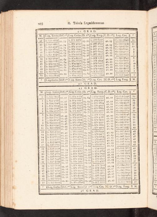 Log. Sinus Log. Coſin. D. 10Log. Tang. Log. Cot. 4 19. 832 1519„„ 9. 865 5362 2.966 6157 10.033 3843 12 42— 22.73— 19. 70————— S. 332 2883, 9. 865 4192 19. 52 9. 966 8692 10. 033 1308 11 9. 832 4246 2 9. 955 3021 119. 53 9.957 1225 10. 942 9778 10 5 222 5600 22* 9. 1849]112·239. 2 10. 03 2 6241 9. 122 709 22. 69 2 798 1347 19. 54. 967 3255 10,033,6241 9 9. 832 6970 22. 9. 365 0577 19. 55 9. 9 75293 O3 2 3707 8 9. 822 3331 22. 67 2.254.9504 19. 56 2.957.3827 10. 032 1173 727 [9. 832 9691 9. 864 8331 9. 968 1360 10. 031 8640 6 5, 833 1050 22. 65 9.86471 56 59 559.968 3893 10.031 6107 5 9. 833 2408 22. 2. 864 5981]19. 60 2.968 6427 10.031 3573 4 9. 833 3766 9. 864 4805 19. 61 9- 968 8960 10. 031 1040/ 3 90. 833 5122[22 9. 864 3629 19. 62 9.959 1493 10. 030 8507] 2 9. 833 6478] 9. 864 2452„ 2. 939 4040 10. 030 5074 1 9.333 7833 ²2.59[9. 864 1275 19.3 9. 96„ 5559 10. 030 3441 0 Log. Coſin. Log. Sinus D. 10 Log. Cot. Log. Tang. M. 47 G K A D. 43 G RA D. Log. Sinus Diff. ¹Log. Coſin.[D. 141Log. Tang. Log. Cot. 5.„ 9. 833 7833 22 9. 564 1473 19. 64 2.759.6559 10. 00 3441 9. 333 9188 /22 2. 864 0096 19. 65 2 969 9091 10. 030 0909 9. 834.0541/, 9. 863 8917 19. 9 9. 970 1624! 10. 029 8376 .83„. 70[9. 970 415 10. 029 5843 , inſer 13 e u3 73, s euſe bsozuszſ ret ſere, zin 7.344 5122. 593 5 19. 69 72 9 20 097 9.834 4507 22. 51 2.363 5375 19.70 2.7709221 10.029 229 9.834 5948 22 2. 863 4194 19. 7102·971 1784 10. 028 8246 9. 334 7294 22. 48 19. 363 7o11 19. 72 9. 971 Sau0 odes 284 19. 834 8646 27 9. 363 1828 19.„[9.971 6818 10. 028 3182 0 e 5., 962. 73 3 40. 0650! d.3s eeſtres e is eei te,aſerdfe ee ieres„e.erisene 5. 532,1347 22. 5. 362 S274 2. 76]2à 92 4415 10. 027 5587 9. 835 2683 22. 2. 862 3274 19. 77 2272 4413 202275587 9. 835 4033„„ 9. 862 7088 1%„g[2.972 6945 10. 027 3055 9. 335 5373 22.43 9. 352 5902119. 78 2. 972 9477 19.027 0523 4 9. 835 6722„„ h. 862 4714.973 200 10. 026 7992 N. b23 Sea5 225 2. he ſe4 19 30 3 53 5 W8. Shs 19. 835 9408 21,5 9. 862 2338 15 5 9. 973 2071 10. 026 2929 T.836,0750122. 33 2. 362 1145 19.84 2. 973 9602 19.029 9495 9. 836 2091[ 24[9- 861 9958 110, 9 9974 2133 10. 025 7867 9. 336 3431 22. 34[2. 361 8767 15. 35 9. 974 4664 10.025 5336 . 133 31 2,les.r En aneſ ee Se ee ku9⸗ ze Sesas 9.836 6109 22, 30 9. 861 6383 19. 8 9.974 9226 025 0273 9. 836 7447 22. 29 9. 861 5190 19. 39 9. 975 2257 10.O24 2743 23 9. 836 8784 ·22. 27[2. 331 3927 19. 91 9. 975 4787 10. C24 5213 24 5. 3370121 22. 26 5. 361 2803 19. 92 9.975 2318 10.024 2682 25[9. 837 1456 22. 25 9. 861 1608 19. 95 9. 975 9849 20.024 0151 26 12. 837 2791 22. 2 9. 861 041² 19.94 9.976 2329 10.O23 zen 27[?. 837 4125 22.22[9. 360 9215 19. 93 9.275 490, 10. 023 5 5 2 2— 7 2— O3 7 5 44 O. O23 2580 28 9. 834 5458 22. 21 9. 350 Re 3 19. 96 5 923 2440— 827 0 29[9. 837 6790 9. 860 6821 9. 976 9970 O. 023 003 30 22. 20[0. 360 5622] ¹9 98 9. 977 2500 O. O2 2 7500 4 Log. Cofin Log. Sinus D 10 L,Og. Cot. Log. Tang. 46 GRAD.