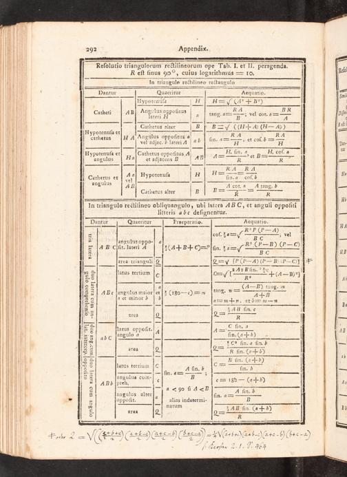 Dantur Quaeritur Aequatio- Hypotenuſa H H— V(42+ B*) Angulus oppofitus RA B R Catheti AB Nd 2720 Atus V a tang. a=; vel cot. 4=— — CGathetus alter B B— V((H-= 4)(I 4) Hypotenuſa et— Ra RA cathetus H A Angulus oppoſitus a— 4— 4ʃ vel adjac. ˙ lateri A V ab fn. a 21 et cof. 5 Hypotenuſa et Cathetus oppoſitus 4 H. fin- a, H. coſ. a angulus Ha et adjacens B AnI A= 5 R4 R A Cathetus et 445 Hypotenuſa V 34 ſin. a coſ. b ang alus 4 B A cot. a A tang. b Cathetus alter V B 5= N