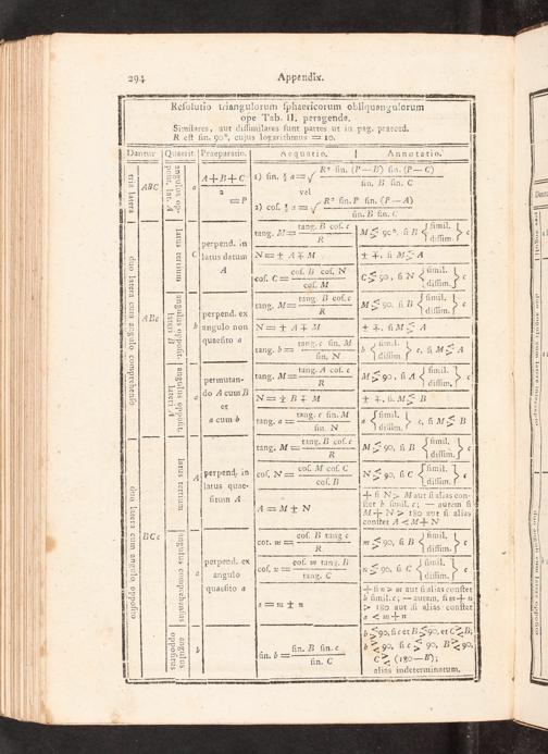 ————— ₰ Reſolutio triangulorum ſphaericorum obliqus ngul orum ope Tab. II. peragenda. Bimmiſafes⸗ aut diſfimilares ſunt partes ut in pag. praeced. eſt fin. 90°, cujus logarithmus= 10. Dantur[Quaerit. Praeparatio. Aequatio. Annotatio. 83 Ra ſin.(P— B) ſin.(P— C) 3. ſ[AT+ B+ C[¹) ün. 2a= V—— 3 14₰—— fin. B fin. C 50==Sa — A 8 2 vel 53 1 P Ra ſin. P fin.(P— 4) 3 8 2) coſ. 1 2 8 1„ 5 6* fin. B ſiu. tang. B coſ. c mil. S tang. M=— M 90°, ſi B 5- 3. R diſſim. 5 perpend. in Cſlatus datum N=+ M 4+†, i Me 4 . 4 a N ſmal — coſ. coſ. 1„ üinnil. 5 coſ. C=— 6& 90, f N