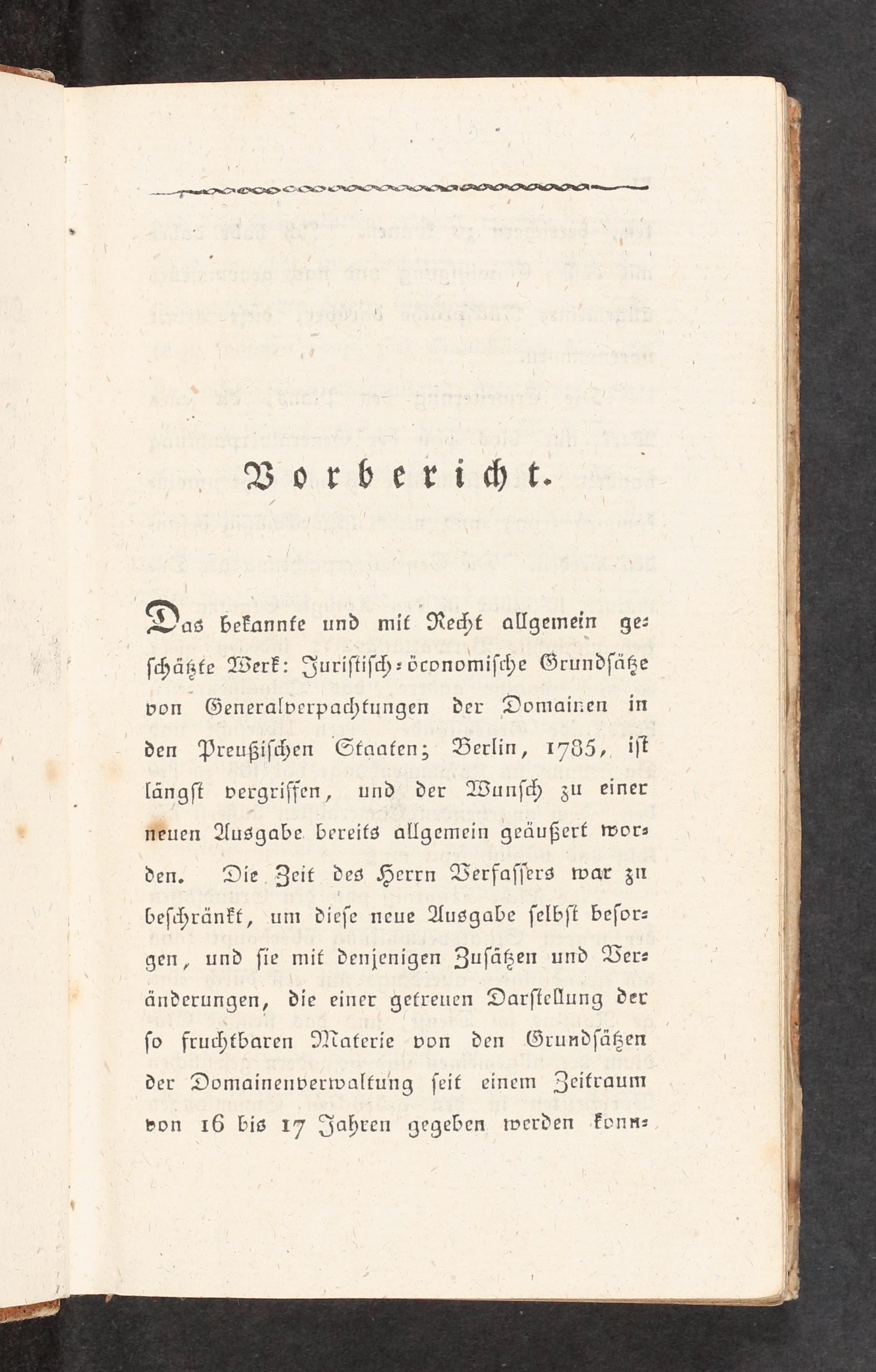 Das befannfe und mif Recht allgemein ge- ſhäßte Werk: Juriſtiſch- dconomiſche Grundſäße von Generalverpachfungen der Domainren in den Preußiſ<en Gtaafen; Berlin, 1785,, iſt längſt vergriſfen, und der Wunſc<; zu einer neuen Ausgabe. bereits allgemein geäußert wor? den. Die Zeit des Herrn Berfaſſers war zn beſhränkt, um dieſe neue Ausgabe ſelbſt beſor- gen, und ſie mif denjenigen Zuſäßen und Ber- änderungen, die einer gefreuen Darſtellung der ſo fruchtbaren Materie von den Grundſjäßen der Domainenverwalfung ſeit einem Zeitraum