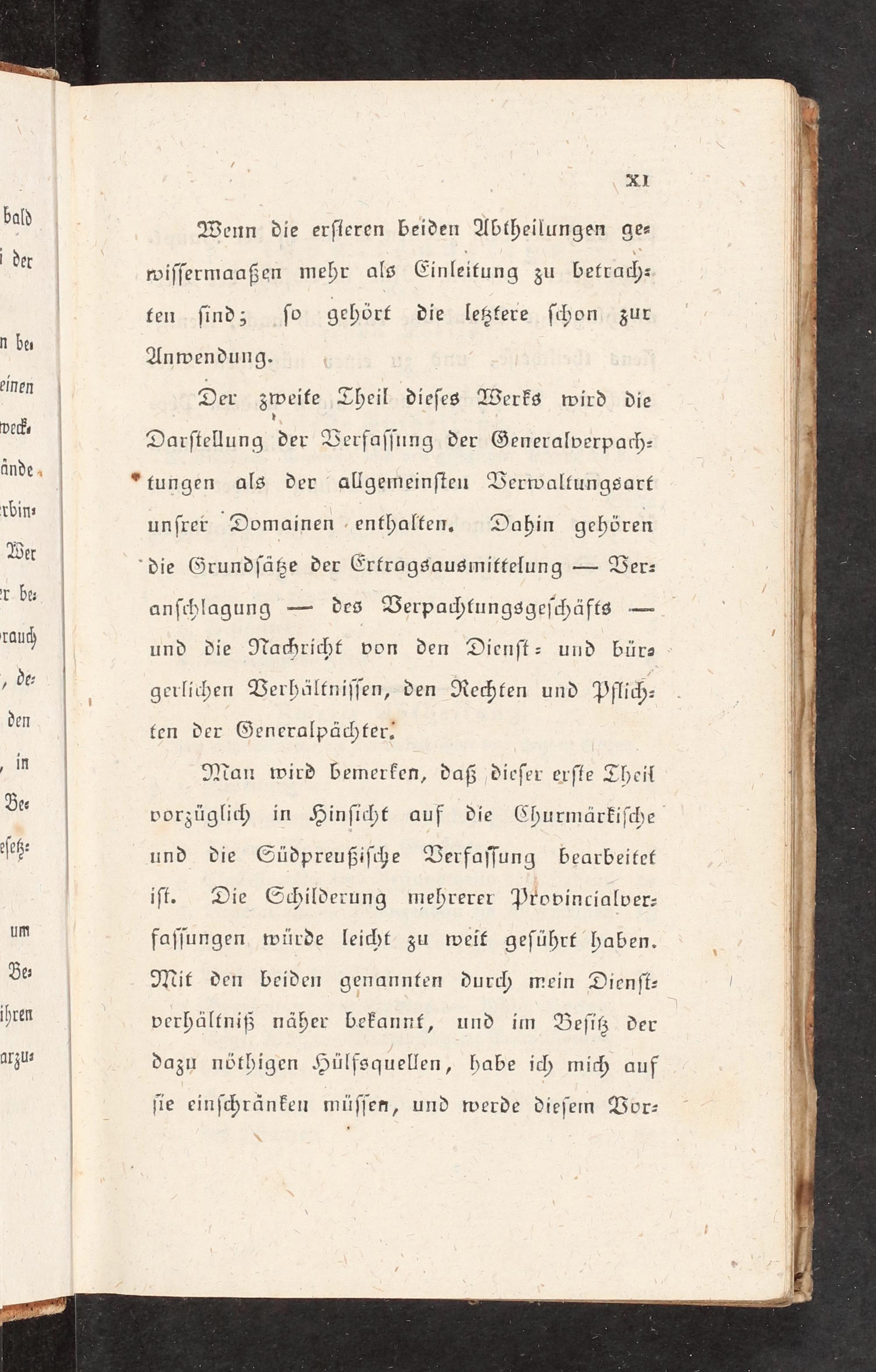 XI 2; Wenn die erſieren beiden Abtheilungen ge- 0 wiſſermaaßen mehr als Einleitung zu betrach: Geil„«(N105E 490 gehört die lesßfere ſ<on zur 4 Anwendung. einen| Der zweife Theil dieſes Werks wird die ves Darſtellung 0 Berſaſſung der Generalverpach- ändex|* fungen als der allgemeinſten Berwaltungsgsart rbin-| unſrer"Domainen- enthalten, Dahin gehören De:|"die Grundſäße der Erfraggaugsmittelung=- Ver: r bes| anſchlagung=- des Berpachtungsgeſchäfts eme rau)| und die Nachricht von den Dienſt- und büra „0|: gerlichen Berhältfniſſen, den Rechten und Pflich: den,| fen der Generalpächter, in| Man wird bemerfen, daß dieſer erſte Theil De| vorzüglich in Hinſißt auf die Churmaäarkiſche ſeh:| und die Güdpreußiſ<e Berfaſſung bearbeitet iſt. Die Gdilderung mehrerer Provincialver- um fajjungen würde leicht zu weit geſührt haben. De: Mit den beiden genannten durc mein Dienſt- ihren| verhältniß näher befannf, und im Beſilz der au| dazu nöthigen Hülſsquellen, habe ich mich auf