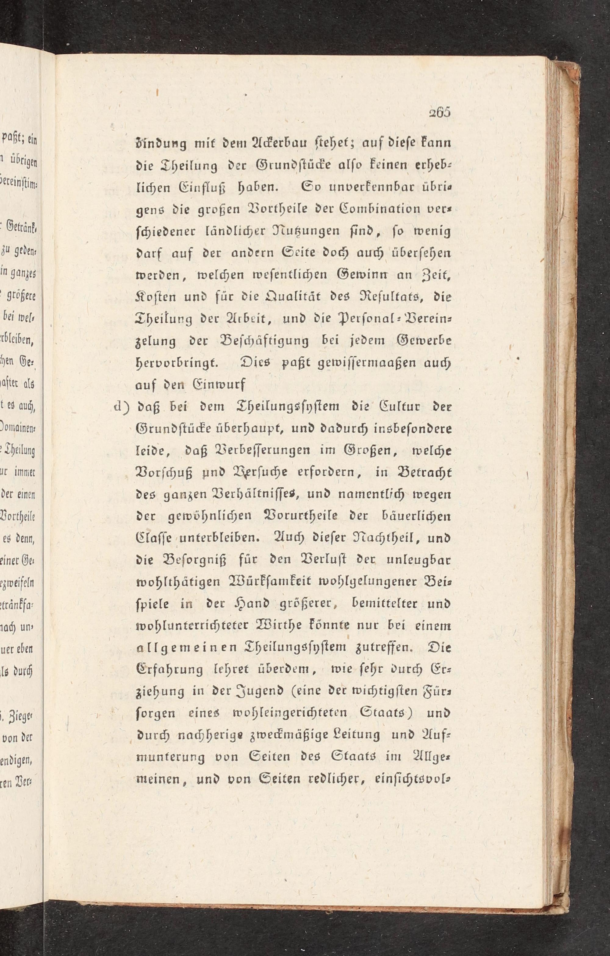 dindung mit dem Aderbau ſtehet; auf dieſe kann die Theilung der Grundſtü>e alſo Feinen erheb- lichen Cinfluß haben. Go unverkennbar übrise gens die großen Vortheile der Combination ver- ſchiedener ländli<er Iußungen ſind, ſo wenig darf auf der andern Seite do) auc< überſehen werden, welchen weſentligen Gewinn an Zeit, Koſten und für die Qualität des Reſultats, die Theilung der Arbeit, und die Perſonal Bereinz2 zelung der Beſchäftigung bei jedem Gewerbe hervorbringt. Dies paßt gewiſſermaaßen auch auf den Einwurf j d) daß bei dem Theilungsſyſtem die Cultur dee Grundſtü>e überhaupt, und dadurc< insbeſondere leide, daß Berbeſſerungen im Großen, welc<e Vorſchuß und Verſuche erfordern, in Betracht des ganzen Berhältniſſes, und namentlich wegen der gewöhnlicgen Borurtheile der bäuerlichen Claſſe-unterbleiben. Auch dieſer Nachtheil, und die Beſorgniß für den Berluſt der unleugbar wohlthätigen Würkſamkeit wohlgelungener Beis? ſpiele in der Hand größerer, bemittelter und wohlunterrichteter Wirthe könnte nur bei einem allgemeinen Theilungsſyſtem zutreffen. Die Erfahrung lehret überdem, wie ſehr dur< Erz ziehung in der Jugend(eine der wichtigſten Fürz ſorgen eines wohleingerichteten Gtaats) und durch naßherige zweEmäßige Leitung und Auf- munferung von Geiten des Staats im Allges meinen, und von Geiten redlicher, einſichtsvol?