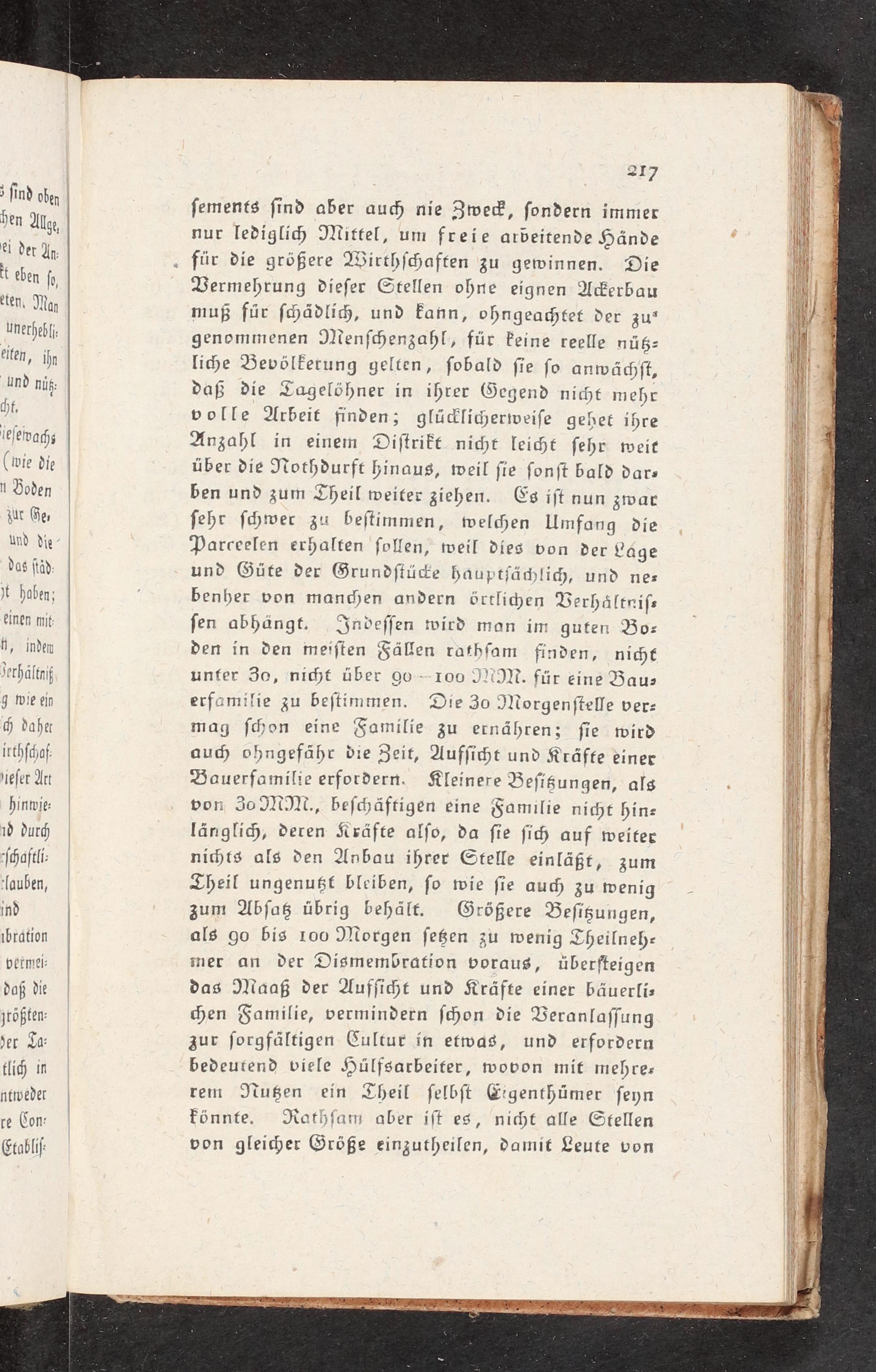 Vermehrung dieſer Stellen ohne eignen A>erbau muß für ſchädli<, und Fann, ohngeactet der zu“ genommenen Menſchenzahl, für Peine reelle nüß- liche Bevölkerung gelten, ſobald ſie ſo anwächſt, daß die Tagelöhner in ihrer Gegend nicht mehr volle Arbeit finden; glüdlicgerweiſe gehet ihre Anzahl in einem Diſtrikt nicht leicht ſehr weit über die Nothdurft hinaus, weil ſie ſonſt bald dar» ben und zum Theil weiter ziehen. Es iſt nun zwar ſehr ſchwer zu beſtimmen, welchen Umfang die Parceelen erhalten ſollen, weil dies von der Läge und Güte der Grundſtüc>e bäuptjächlich, und nes benher von mandjen andern örtlichen Verhältniſe ſen abhängt. Jnveſſen wird mon im guten Bo- den in den meiſten Fällen rathſam finden, nicht unter 30, nicht über 90-100 MM. für eine Bau» erfamilie zu beſtimmen. Die 30 Morgenſtelle ver- mag ſchon eine Familie zu ernähren; ſie wird au<h ohngefſähr die Zeit, Aufſic<ht und Kräfte einer Bauerfamilie erfordern. Kleinere Beſigßungen, als von 30 MN, beſchäftigen eine Familie nicht hinz länglich, deren Kräfte alſo, da ſie ſich auf weiter nichts als den Anbau ihrer Stelle einläßt, zum Theil ungenußt bleiben, ſo wie ſie au zu wenig zum Abſatß übrig behält. Größere Beſigungen, als go bis 100 Morgen ſeßen zu wenig Theilneh- mer an der Digmembration voraus, überfteigen das Maaß der Aufſicßt und Kräfte einer bäuerli- <en Familie, vermindern ſchon die Veranlaſſung zur ſorgfältigen Cultur in etwas, und erfordern bedeutend viele Huülfsarbeiter, wovon mit mehre- rem ITußen ein Theil ſelbſt G!'genthümer ſeyn Fönnte. Rathſam aber iſt es, nicht alle Stellen von gleicher Größe einzutheilen, damit Leute von