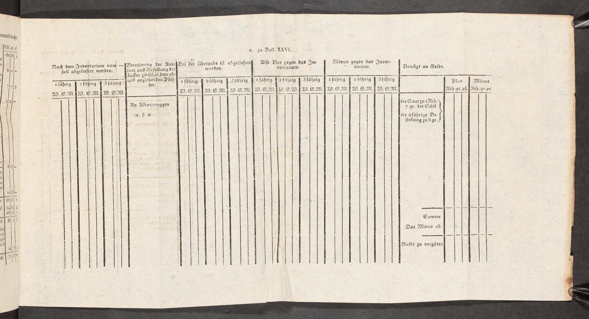 venfarium<=<1€ ar 1 Beträgt an Gelde., r fährig Ff 2 fährig| 3fährig| 1fährig| 2fährig| 3fährig Prus 0 E. Tu Minus 23. S.M.JW. S.W. 83. S.M jW. S.M.fi W. S.M.3 W. SM. Reh.gar. pf. IRth. gr.pr die Saatzu 1Nth. 7 gr. der E<fl 1 die 2fährige Be- ſtellung zu 8 gr.) Summe Das Minus ab Bleibt zu vergüten |