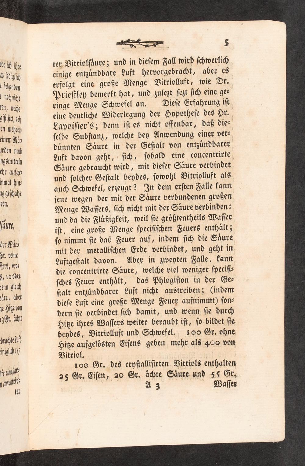 ter Vitriolſaͤure; und in dieſem Fall wird ſchwerlich einige entzuͤndbare Luft hervorgebracht, aber es erfolgt eine große Menge Vitriolluft, wie Dr. Prieſtley bemerkt hat, und zulezt ſezt ſich eine ge⸗ ringe Menge Schwefel an. Dieſe Erfahrung iſt eine deutliche Widerlegung der Hypotheſe des Hr. Lavoiſier's; denn iſt es nicht offenbar, daß die⸗ ſelbe Subſtanz, welche bey Anwendung einer ver⸗ duͤnnten Saͤure in der Geſtalt von entzuͤndbarer Luft davon geht, ſich, ſobald eine concentrirte Saͤure gebraucht wird, mit dieſer Saͤure verbindet und ſolcher Geſtalt beydes, ſowohl Vitriolluft als auch Schwefel, erzeugt? In dem erſten Falle kann jene wegen der mit der Saͤure verbundenen großen Menge Waſſeers, ſich nicht mit der Saͤure verbinden: und da die Fluͤßigkeit, weil ſie groͤßtentheils Waſſer iſt, eine große Menge ſpecifiſchen Feuers enthaͤlt; ſo nimmt ſie das Feuer auf, indem ſich die Saͤure mit der metalliſchen Erde verbindet, und geht in Luftgeſtalt davon. Aber in zweyten Falle, kann die concentrirte Saͤure, welche viel weniger ſpeeifi⸗ ſches Feuer enthaͤlt, das Phlogiſton in der Ge⸗ ſtalt entzuͤndbarer Luft nicht austreiben;(indem dieſe Luft eine große Menge Feuer aufnimmt) ſon⸗ dern ſie verbindet ſich damit, und wenn ſie durch Hitze ihres Waſſers weiter beraubt iſt, ſo bildet ſie beydes, Vitriolluft und Schwefel. 100 Gr. ohne Hitze aufgeloͤsten Eiſens geben mehr als 400 von Vitriol. 100 Gr. des cryſtalliſirten Vitriols enthalten 25 Gr. Eiſen, 20 Gr. aͤchte Saͤure und 55 Gr. A 3 Waſſer