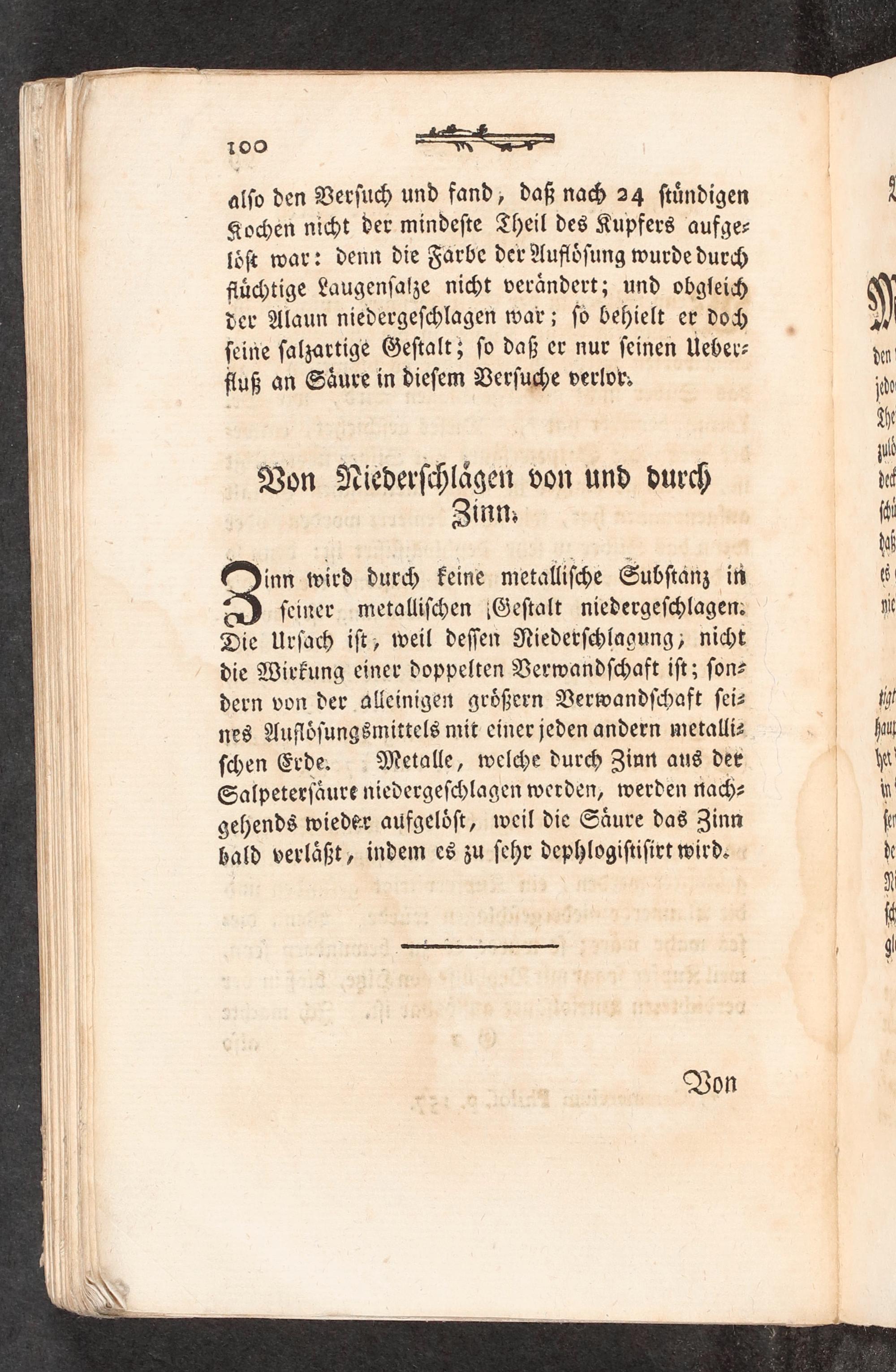 inn wird durch keine metalliſche Subſtanz in ſeiner metalliſchen Geſtalt niedergeſchlagen. Die Urſach iſt, weil deſſen Niederſchlagung, nicht die Wirkung einer doppelten Verwandſchaft iſt; ſon⸗ dern von der alleinigen groͤßern Verwandſchaft ſei⸗ nes Aufloͤſungsmittels mit einer jeden andern metalli⸗ ſchen Erde. Metalle, welche durch Zinn aus der Salpeterſaͤure niedergeſchlagen werden, werden nach⸗ gehends wieder aufgeloͤſt, weil die Saͤure das Zinn bald verlaͤßt, indem es zu ſehr dephlogiſtiſirt wird.