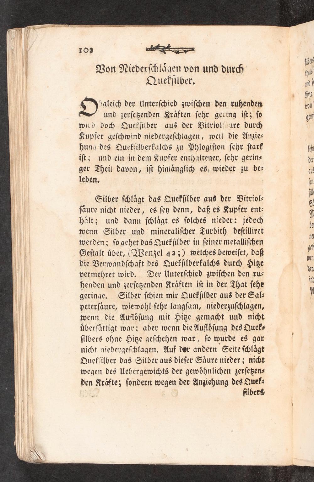 Silber ſchlaͤgt das Quekſilber aus der Vitriol⸗ ſaͤure nicht nieder, es ſey denn, daß es Kupfer ent⸗ hoͤlt; und dann ſchlaͤgt es ſolches nieder: jedoch wenn Silber und mineraliſcher Turbith deſtilliret werden; ſo gehet das Quekſilber in ſeiner metalliſchen Geſtalt uͤber, Wenzel 42;) weiches beweiſet, daß die Verwandſchaft des Quekſilberkalchs durch Hitze vermehret wird. Der Unterſchied zwiſchen den ru⸗ henden und zerſetzenden Kraͤften iſt in der That ſehr geringe. Silber ſchien mir Quekſilber aus der Sal⸗ peterſaͤure, wiewohl ſehr langſam, niederzuſchlagen, wenn die Aufloͤſung mit Hitze gemacht und nicht uͤberſaͤttigt war; aber wenn die Aufloͤſung des Quek⸗ ſilbers ohne Hitze geſchehen war, ſo wurde es gar nicht niedergeſchlagen. Auf der andern Seite ſchlaͤgt Quekſilber das Silber aus dieſer Saͤure nieder; nicht wegen des Uebergewichts der gewoͤhnlichen zerſetzen⸗ den Kraͤfte; ſondern wegen der Anziehung des Quek⸗ filbers