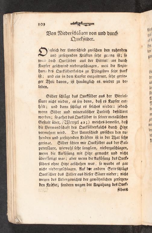 O'la der Unterſchied zwiſchen den ruhenden und zerſetzenden Kraͤften ſehr gering iſt; ſo wird doch Quekſilber aus der Vitriol ure durch Kupfer geſchwind niedergeſchlagen, weil die Anzie⸗ hung des Quekſilberkalchs zu Phlogiſton ſehr ſtark iſt; und ein in dem Kupfer enthaltener, ſehr gerin⸗ ger Theil davon, iſt hinlaͤnglich es wieder zu be⸗ leben.