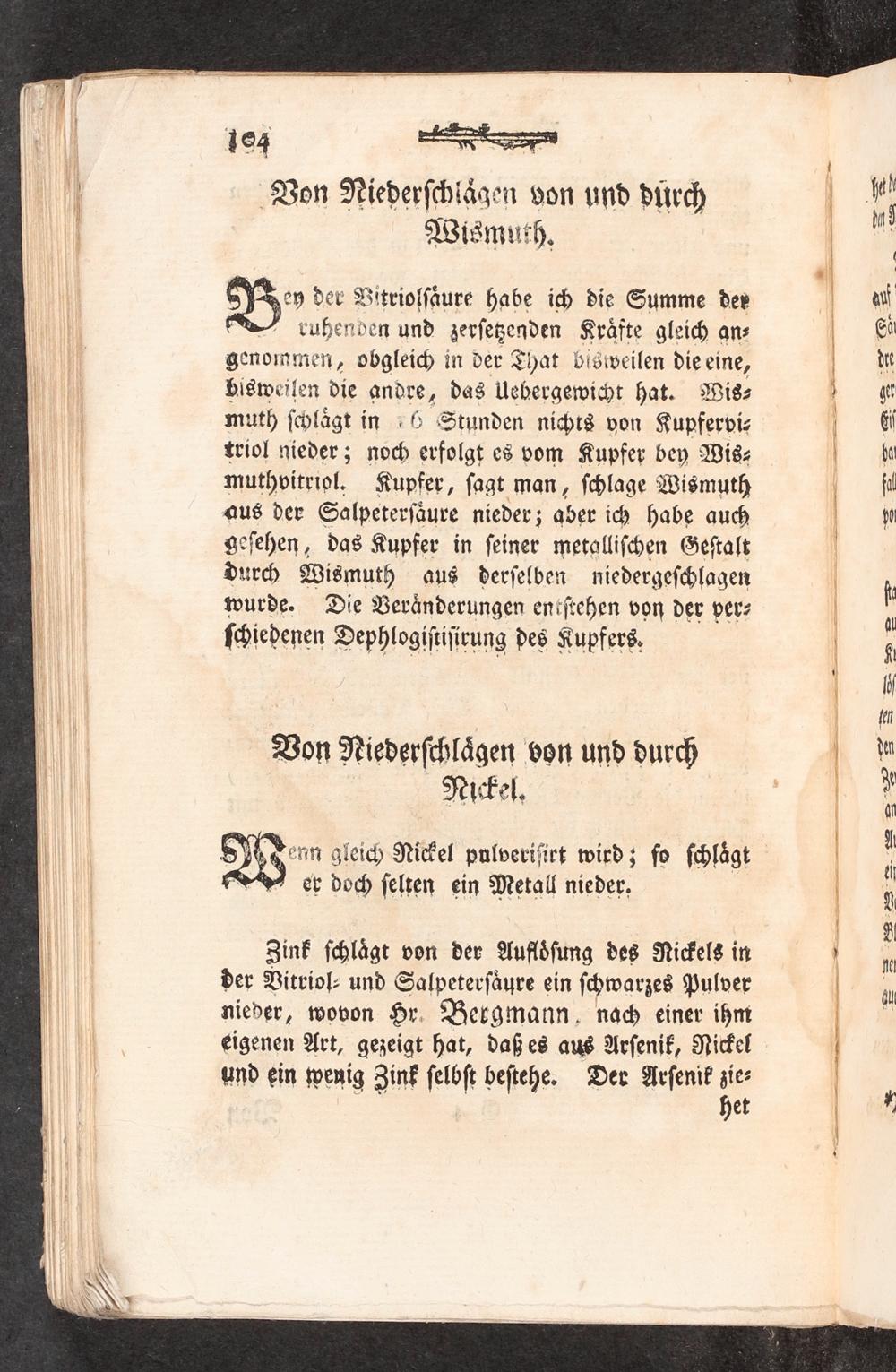 muth ſchlaͤgt in 6 Stunden nichts von Kupfervi⸗ triol nieder; noch erfolgt es vom Kupfer bey Wis⸗ muthvitriol. Kupfer, ſagt man, ſchlage Wismuth aus der Salpeterſaͤure nieder; aber ich habe auch geſehen, das Kupfer in ſeiner metalliſchen Geſtalt durch Wismuth aus derſelben niedergeſchlagen wurde. Die Veraͤnderungen entſtehen von der ver⸗ ſchiedenen Dephlogiſtiſirung des Kupfers.