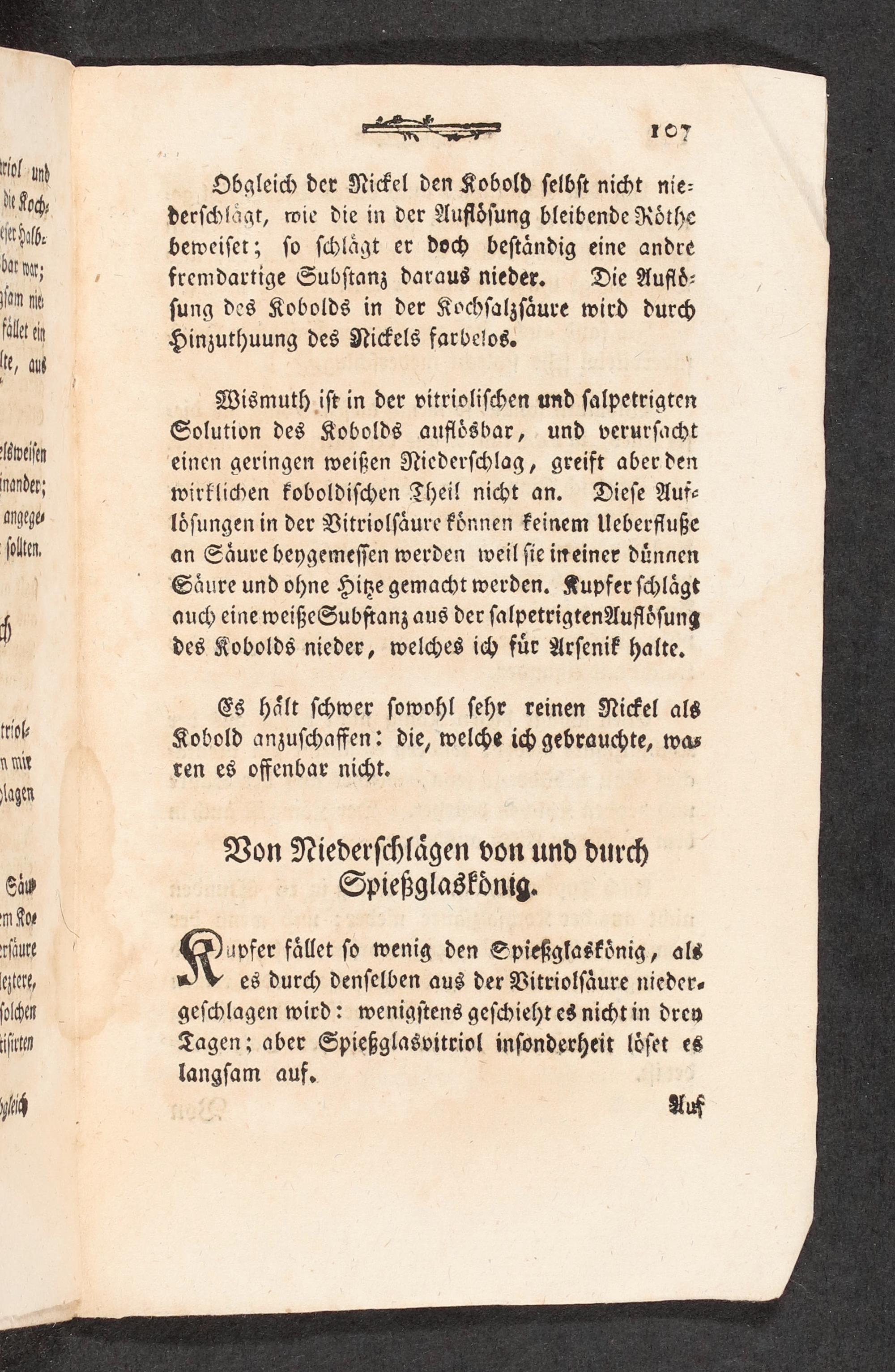Wismuth iſt in der vitrioliſchen und ſalpetrigten Solution des Kobolds aufloͤsbar, und verurſacht einen geringen weißen Niederſchlag, greift aber den wirklichen koboldiſchen Theil nicht an. Dieſe Auf⸗ loͤſungen in der Vitriolſaͤure koͤnnen keinem Ueberfluße an Saͤure beygemeſſen werden weil ſie ineiner duͤngen Saͤure und ohne Hitze gemacht werden. Kupfer ſchlaͤgt auch eine weiße Subſtanz aus der ſalpetrigten Aufloͤſung des Kobolds nieder, welches ich fuͤr Arſenik halte.