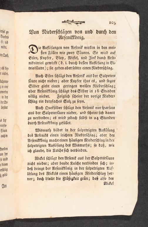 Wismuth bildet in der ſalpetrigten Aufloͤſung des Arſeniks einen leichten Niederſchlag; aber der Arſenikkoͤnig macht einen haͤufigen Niederſchlag in der ſalpetrigten Aufloͤſung des Wismuths; ſo daß, wie ich glaube, die Kalche ſich verbinden.