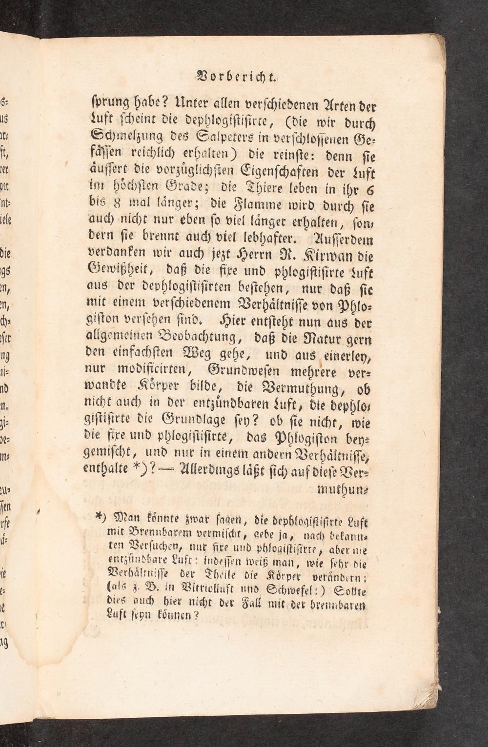 im hoͤchſten Grade; die Thiere leben in ihr 6 bis 8 mal laͤnger; die Flamme wird durch ſie auch nicht nur eben ſo viel laͤnger erhalten, ſon⸗ dern ſie brennt auch viel lebhafter. Auſſerdem verdanken wir auch jezt Herrn R. Kirwan die Gewißheit, daß die fixe und phlogiſtiſirte Luft aus der dephlogiſtiſirten beſtehen, nur daß ſie mit einem verſchiedenem Verhaͤltniſſe von Phlo⸗ giſton verſehen ſind. Hier entſteht nun aus der allgemeinen Beobachtung, daß die Natur gern den einfachſten Weg gehe, und aus einerley, nur modiſicirten, Grundweſen mehrere ver⸗ wandte Koͤrper bilde, die Vermuthung, ob nicht auch in der entzuͤndbaren zLuft, die dephlo⸗ giſtiſirte die Grundlage ſey? ob ſie nicht, wie die fixe und phlogiſtiſirte, das Phlogiſton bey⸗ gemiſcht, und nur in einem andern Verhaͤltniſſe, enthalte*)?— Allerdings laͤßt ſich auf dieſe Ver⸗