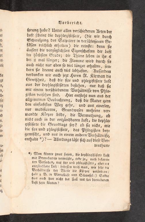 *) Man koͤnnte zwar ſagen, die dephlogiſtiſirte Luft mit Brennbarem vermiſcht, gebe ja, nach bekann⸗ ten Verſuchen, nur fire und phlogiſtiſirte, aber nie entzuͤndbare Luft: indeſſen weiß man, wie ſehr die Verhaͤltniſſe der Theile die Koͤrper veraͤndern: (als z. B. in Vitriolluft und Schwefel:) Sollte dies auch hier nicht der Fall mit der brennbaren Luft ſeyn koͤnnen?