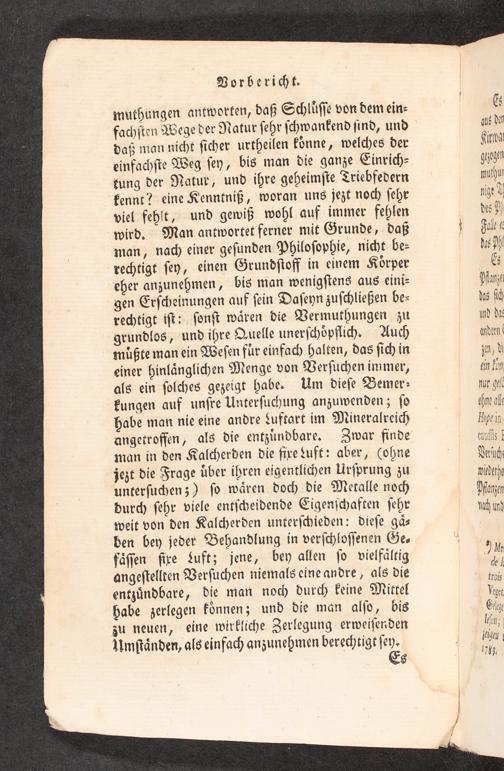 muthungen antworten, daß Schluͤſſe von dem ein⸗ fachſten Wege der Natur ſehr ſchwankend ſind, und daß man nicht ſicher urtheilen koͤnne, welches der einfachſte Weg ſey, bis man die ganze Einrich⸗ tung der Natur, und ihre geheimſte Triebfedern kennt? eine Kenntniß, woran uns jezt noch ſehr viel fehlt, und gewiß wohl auf immer fehlen wird. Man antwortet ferner mit Grunde, daß man, nach einer geſunden Philoſophie, nicht be⸗ rechtigt ſey, einen Grundſtoff in einem Koͤrper eher anzunehmen, bis man wenigſtens aus eini⸗ gen Erſcheinungen auf ſein Daſeyn zuſchließen be⸗ rechtigt iſt: ſonſt waͤren die Vermuthungen zu grundlos, und ihre Quelle unerſchoͤpflich. Auch muͤßte man ein Weſen fuͤr einfach halten, das ſich in einer hinlaͤnglichen Menge von Verſuchen immer, als ein ſolches gezeigt habe. Um dieſe Bemer⸗ kungen auf unſre Unterſuchung anzuwenden; ſo habe man nie eine andre Luftart im Mineralreich angetroffen, als die entzuͤndbare. Zwar finde man in den Kalcherden die fixe Luft: aber,(ohne jezt die Frage uͤber ihren eigentlichen Urſprung zu unterſuchenz) ſo waͤren doch die Metalle noch durch ſehr viele entſcheidende Eigenſchaften ſehr weit von den Kalcherden unterſchieden: dieſe gaͤ⸗ ben bey jeder Behandlung in verſchloſſenen Ge⸗ faͤſſen fixe Luft; jene, bey allen ſo vielfaͤltig angeſtellten Verſuchen niemals eine andre, als die entzuͤndbare, die man noch durch keine Mittel habe zerlegen koͤnnen; und die man alſo, bis zu neuen, eine wirkliche Zerlegung erweiſenden Umſtaͤnden, als einfach anzunehmen berechtigt e