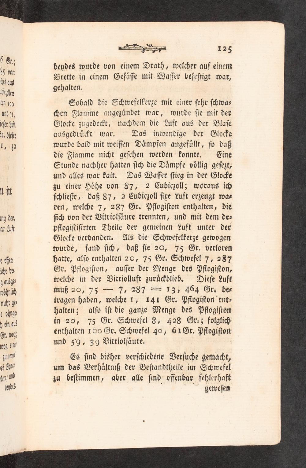 Sobald die Schwefelkerze mit einer ſehr ſchwa⸗ chen Flamme angezuͤndet war, wurde ſie mit der Glocke zugedeckt, nachdem die Luft aus der Blaſe ausgedruͤckt war. Das inwendige der Glocke wurde bald mit weiſſen Daͤmpfen angefuͤllt, ſo daß die Flamme nicht geſehen werden konnte. Eine Stunde nachher hatten ſich die Daͤmpfe voͤllig geſezt, und alles war kalt. Das Waſſeer ſtieg in der Glocke zu einer Hoͤhe von 87, 2 Cubiczoll; woraus ich ſchließe, daß 87, 2 Cubiczoll fixe Luft erzeugt wa⸗ ren, welche 7, 287 Gr. Pflogiſton enthalten, die ſich von der Vitriolſaͤure trennten, und mit dem de⸗ pflogiſtiſirten Theile der gemeinen Luft unter der