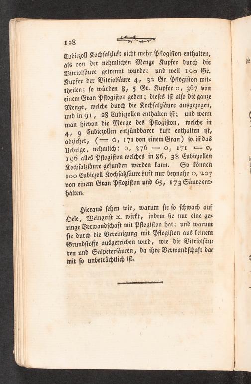 Cubiczoll Kochſalzluft nicht mehr Pflogiſton enthalten, als von der nehmlichen Menge Kupfer durch die Vitriolſaͤure getrennt wurde: und weil 100 Gr. Kupfer der Vitriolſaͤure 4, 32 Gr Pflogiſton mit⸗ theilen; ſo wuͤrden 8, 5 Gr. Kupfer 0, 367 von einem Gran Pflogiſton geben; dieſes iſt alſo die ganze Menge, welche durch die Kochſalzſaͤure ausgezogen, und in 91, 28 Cubiczollen enthalten iſt; und wenn man hievon die Menge des Pflogiſton, welche in 4, 9 Cubiczollen entzuͤndbarer Luft enthalten iſt, abziehet,(= 0, 171 von einem Gran) ſo iſt das Uebrige, nehmlich: O, 375— 0, 171= 0, 196 alles Pflogiſton welches in 86, 38 Cubiczollen Kochſalzſaͤure gefunden werden kann. So koͤnnen 100 Cubiczoll Kochſalzſaͤure Luft nur beynahe 0, 227 von einem Gran Pflogiſton und 65, 173 Saure ent⸗ halten 8