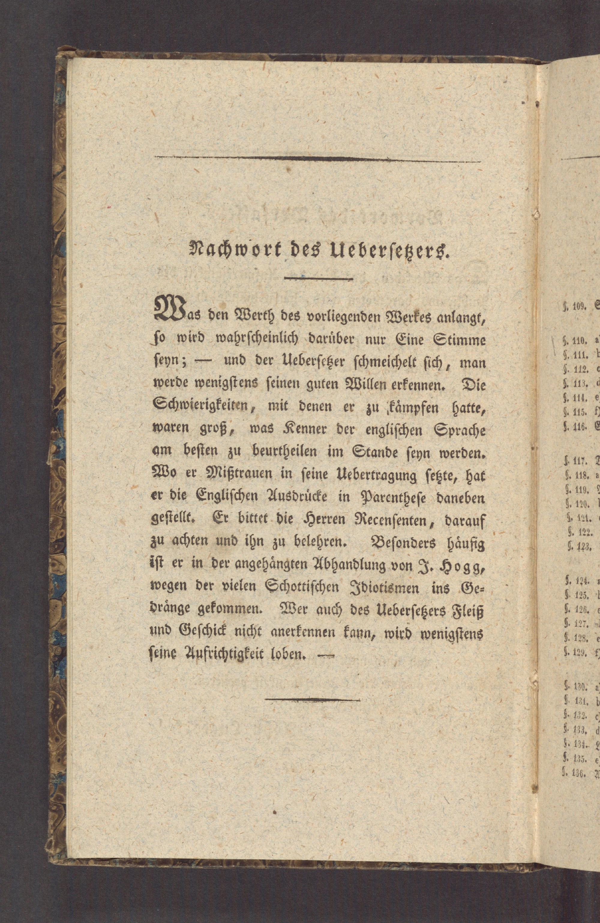 Wo⸗ den Werth des vorliegenden Werkes anlangt, ſo wird wahrſcheinlich daruͤber nur Eine Stimme ſeyn;— und der Ueberſetzer ſchmeichelt ſich, man werde wenigſtens ſeinen guten Willen erkennen. Die Schwierigkeiten, mit denen er zu kaͤmpfen hatte, waren groß, was Kenner der engliſchen Sprache am beſten zu beurtheilen im Stande ſeyn werden. Wo er Mißtrauen in ſeine Uebertragung ſetzte, hat er die Engliſchen Ausdruͤcke in Parentheſe daneben geſtellt. Er bittet die Herren Recenſenten, darauf zu achten und ihn zu belehren. Beſonders haͤufig iſt er in der angehaͤngten Abhandlung von J. Hogg, wegen der vielen Schottiſchen Idiotismen ins Ge⸗ draͤnge gekommen. Wer auch des Ueberſetzers Fleiß und Geſchick nicht anerkennen kann, wird wenigſtens ſeine Aufrichtigkeit loben.—
