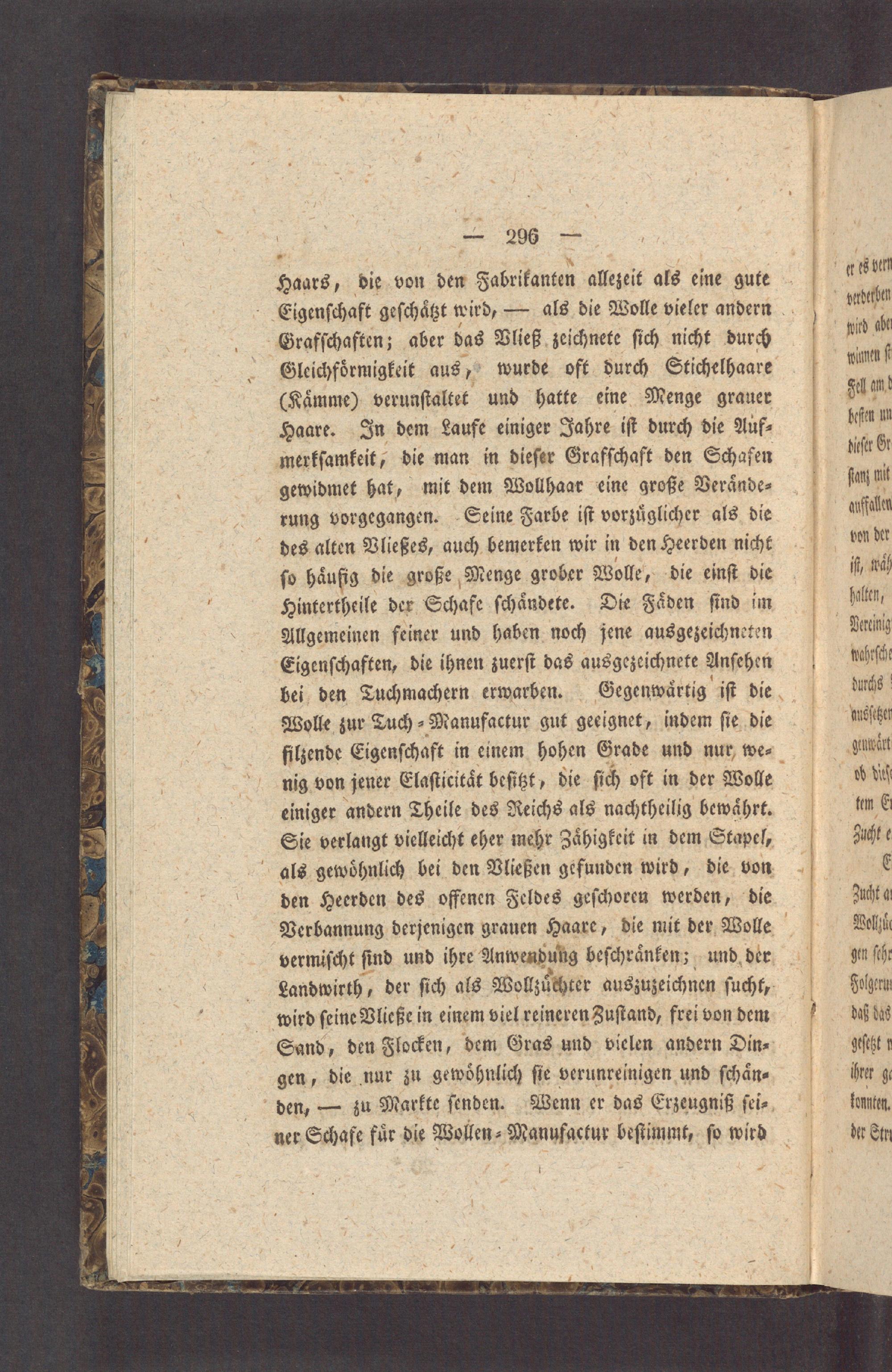Haars, die von den Fabrikanten allezeit als eine gute Eigenſchaft geſchaͤtzt wird,— als die Wolle vieler andern Grafſchaften; aber das Vließ zeichnete ſich nicht durch Gleichfoͤrmigkeit aus, wurde oft durch Stichelhaare (Kaͤmme) verunſtaltet und hatte eine Menge grauer Haare. In dem Laufe einiger Jahre iſt durch die Auf⸗ merkſamkeit, die man in dieſer Grafſchaft den Schafen gewidmet hat, mit dem Wollhaar eine große Veraͤnde⸗ rung vorgegangen. Seine Farbe iſt vorzuͤglicher als die des alten Vließes, auch bemerken wir in den Heerden nicht ſo haͤuſig die große Menge grober Wolle, die einſt die Hintertheile der Schafe ſchaͤndete. Die Faͤden ſind im Allgemeinen feiner und haben noch jene ausgezeichneten Eigenſchaften, die ihnen zuerſt das ausgezeichnete Anſehen bei den Tuchmachern erwarben. Gegenwaͤrtig iſt die Wolle zur Tuch⸗Manufactur gut geeignet, indem ſie die filzende Eigenſchaft in einem hohen Grade und nur we⸗ nig von jener Elaſticitaͤt beſitzt, die ſich oft in der Wolle einiger andern Theile des Reichs als nachtheilig bewaͤhrt. Sie verlangt vielleicht eher mehr Zaͤhigkeit in dem Stapel, als gewoͤhnlich bei den Vließen gefunden wird, die von den Heerden des offenen Feldes geſchoren werden, die Verbannung derjenigen grauen Haare, die mit der Wolle vermiſcht ſind und ihre Anwendung beſchraͤnken; und der