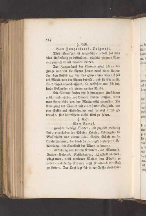 Feuchte niedrige Weiden, die zugleich mosartig ſind, vrrurſachen den Schafen Kröpfe, Leberegeln, die Waſſerſucht und andere Übel. Solche Schafe werfen kranke Lämmer, die durch die geringſte fehlerhafte Be⸗ handlung, die Krankheit der Altern bekommen.