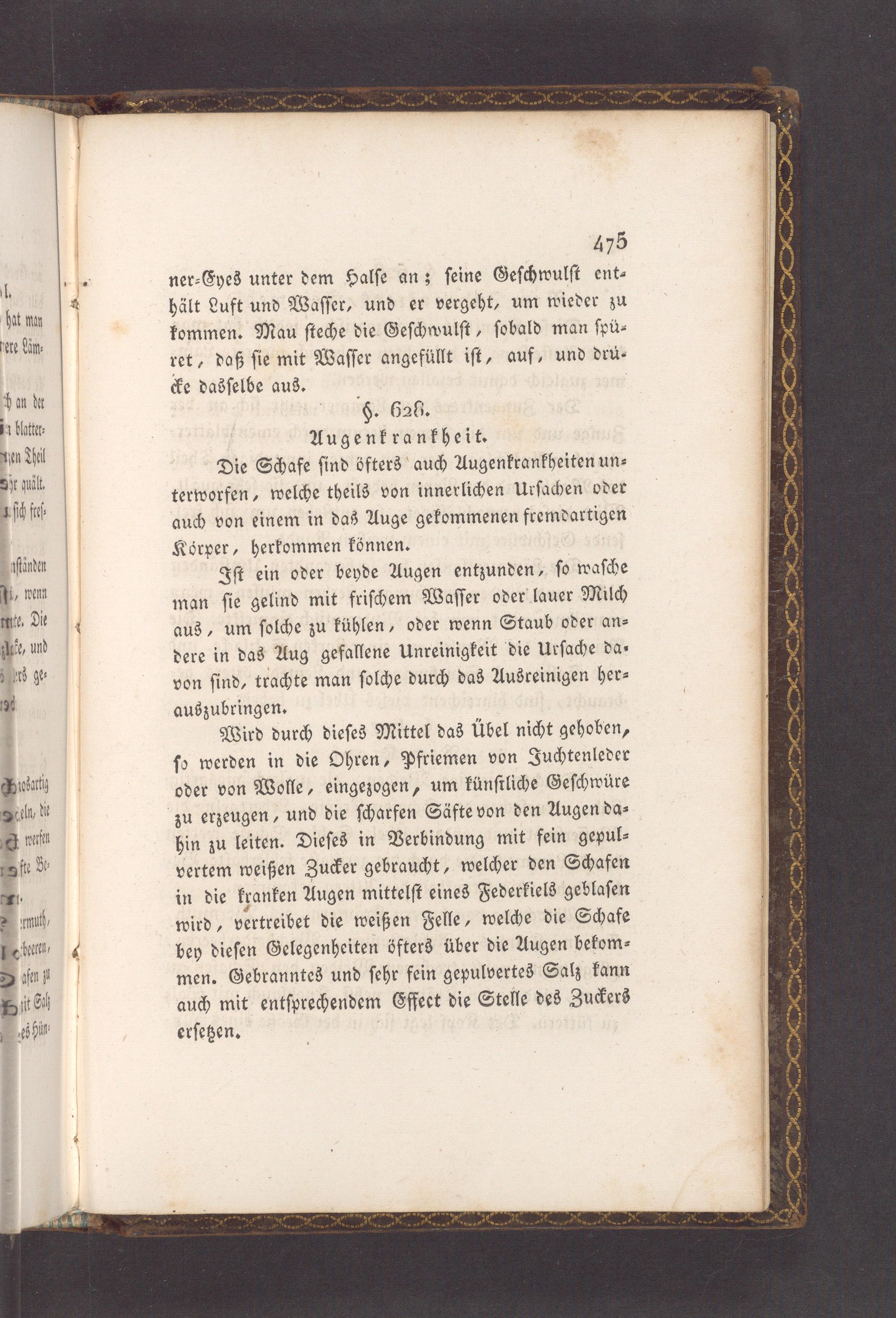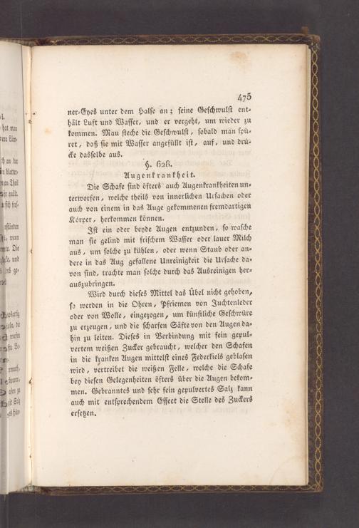 hin zu leiten. Dieſes in Verbindung mit fein gepul— vertem weißen Zucker gebraucht, welcher den Schafen in die kranken Augen mittelſt eines Federkiels geblaſen wird, vertreibet die weißen Felle, welche die Schafe bey dieſen Gelegenheiten öfters über die Augen bekom⸗ men. Gebranntes und ſehr fein gepulvertes Salz kann auch mit entſprechendem Effeet die Stelle des Zuckers erſetzen.