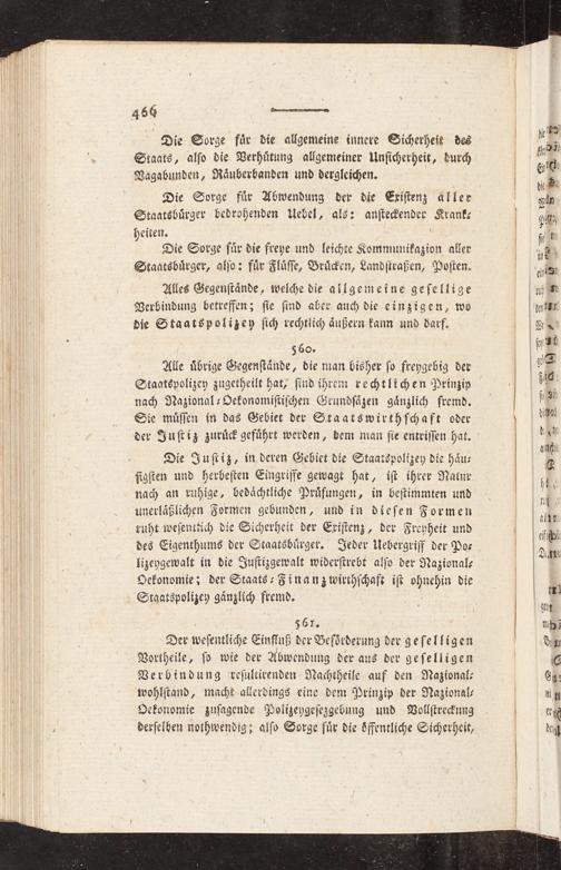 Der weſentliche Einfluß der Befoͤrderung der geſelligen Vortheile, ſo wie der Abwendung der aus der geſelligen Verbindung reſultirenden Nachtheile auf den Nazional⸗ wohlſtand, macht allerdings eine dem Prinzip der Nazional⸗ Oekonomie zuſagende Polizeygeſezgebung und Vollſtreckung derſelben nothwendig; alſo Sorge fuͤr die oͤffentliche Sicherheit,